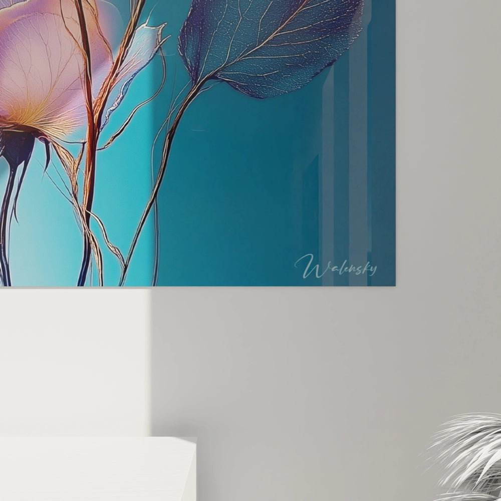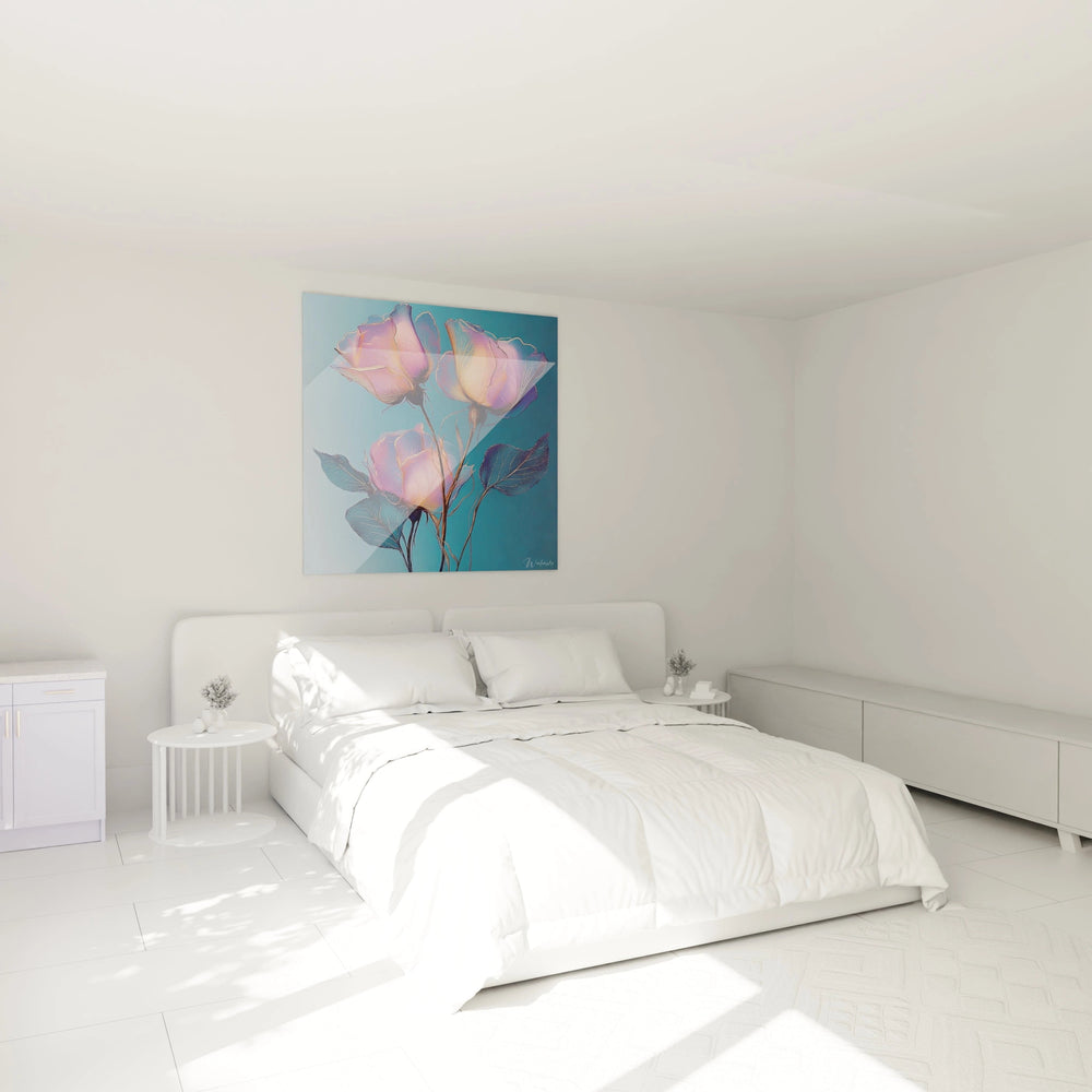À travers une technique unique mêlant couches translucides et détails minutieux, ce tableau sublime la délicatesse des roses. Les pétales semblent illuminés de l’intérieur, dévoilant leurs nervures avec une finesse presque palpable. Le fond dégradé turquoise crée un contraste surprenant et élégant, faisant ressortir les nuances vibrantes de violet et de rose pour un spectacle visuel inédit.