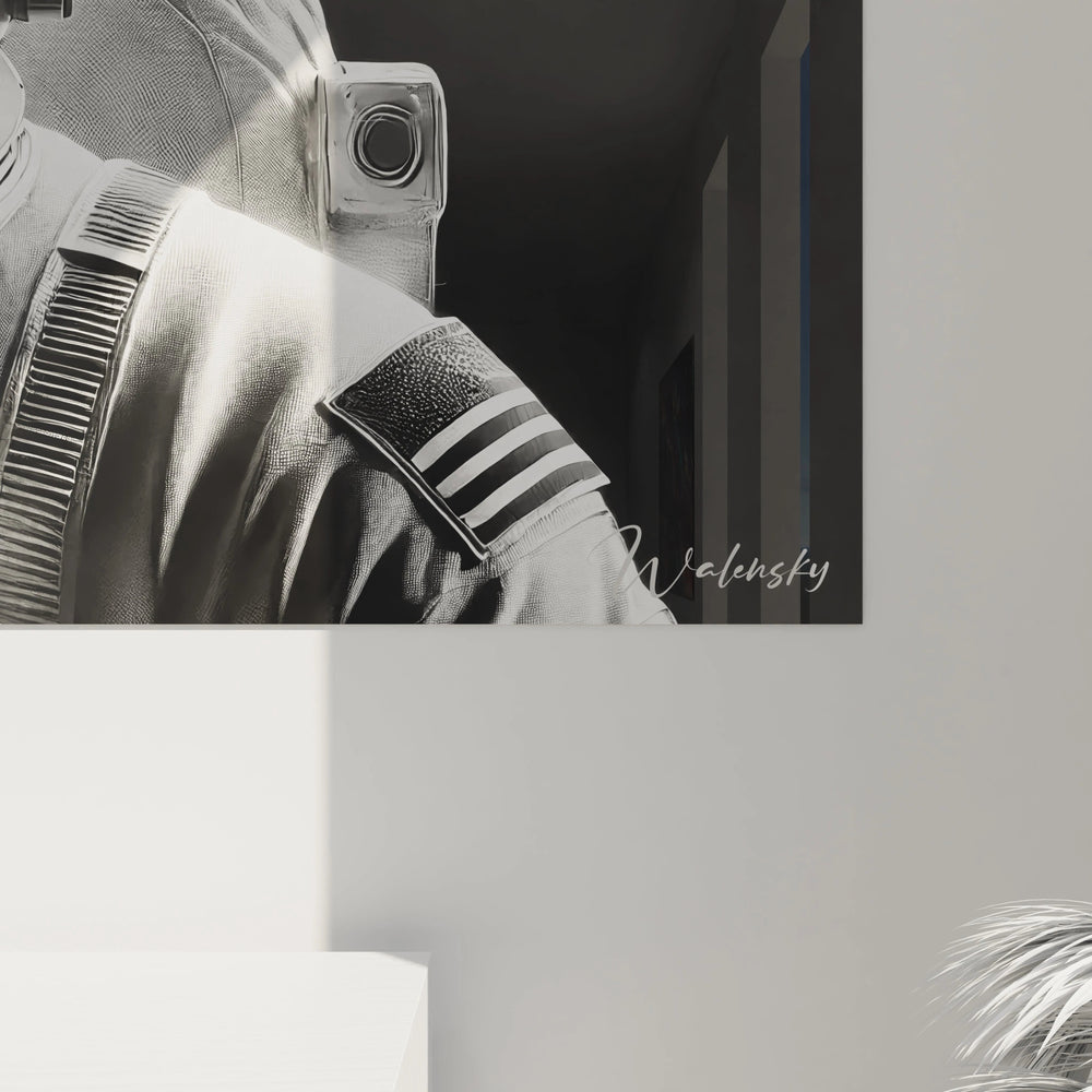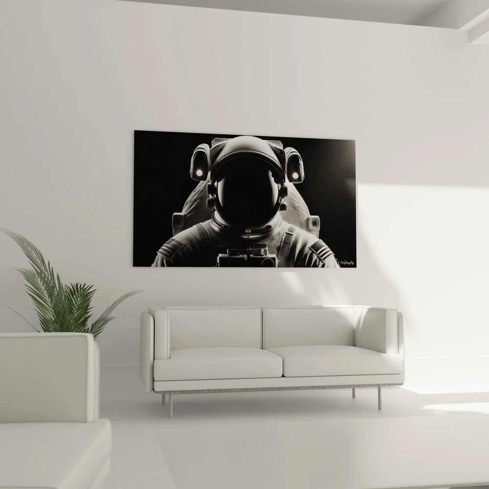 Chaque détail a été minutieusement sculpté dans un jeu de noir, blanc et gris acier, révélant la finesse du tissu contre la rigueur du métal. La lumière, subtilement dosée, dessine les volumes et capte le regard, offrant une profondeur presque palpable. Le rendu hyperréaliste confère au tableau une vibration unique, comme si l’astronaute pouvait à tout moment s’animer et vous inviter à l’accompagner dans sa quête.