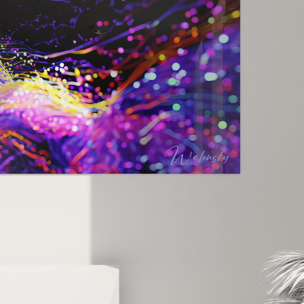 La palette chromatique de ce tableau décoratif neuronal symbolise la richesse des impulsions électriques cérébrales. Les couleurs vives représentent l'activité synaptique intense, tandis que la dispersion des particules évoque la transmission de l'information dans le système nerveux. Cette représentation artistique transforme la complexité biologique en beauté visuelle accessible, faisant de ce tableau un élément décoratif à la fois scientifique et esthétique pour tout espace moderne.