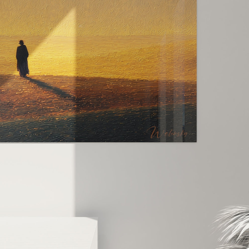 Ce tableau mural désert capture un moment de pure contemplation dans l'immensité saharienne. Au centre de la composition, une silhouette solitaire se dresse sur une dune, créant un point focal saisissant contre l'horizon infini. La peinture désert coucher de soleil révèle une technique picturale raffinée, où chaque coup de pinceau texturé évoque les grains de sable portés par les vents du désert. L'artiste maîtrise parfaitement la représentation de cette atmosphère désertique dorée, transformant la toile en une fenêtre ouverte sur l'immensité du Sahara. La figure humaine, réduite à sa plus simple expression, incarne la fragilité de l'homme face à la grandeur naturelle. Cette œuvre d'art désert minimaliste transcende la simple représentation paysagère pour devenir une méditation visuelle sur la solitude et la contemplation. La texture de la peinture, particulièrement visible dans le traitement du ciel et des dunes, confère une dimension tactile à l'ensemble, invitant le spectateur à ressentir la chaleur et la sérénité de ce moment suspendu. Ce tableau désert moderne s'inscrit parfaitement dans une démarche artistique contemporaine, où la simplicité de la composition révèle la complexité des émotions humaines face à l'infini.