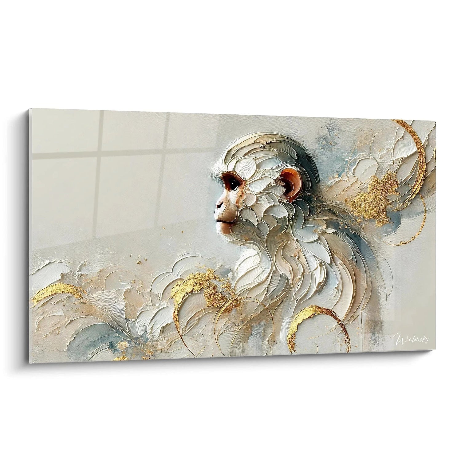 Le singe représenté ici incarne à la fois la curiosité et la sagesse. Son regard tourné vers l’horizon vous invite à un moment suspendu, une pause où se mêlent introspection et apaisement. Autour de lui, des volutes abstraites évoquent les flux d’énergie, symboles d’une harmonie entre instinct premier et réflexion élevée. Cette dimension spirituelle donne au tableau une aura presque mystique, à la fois apaisante et puissante.