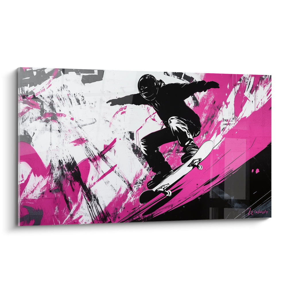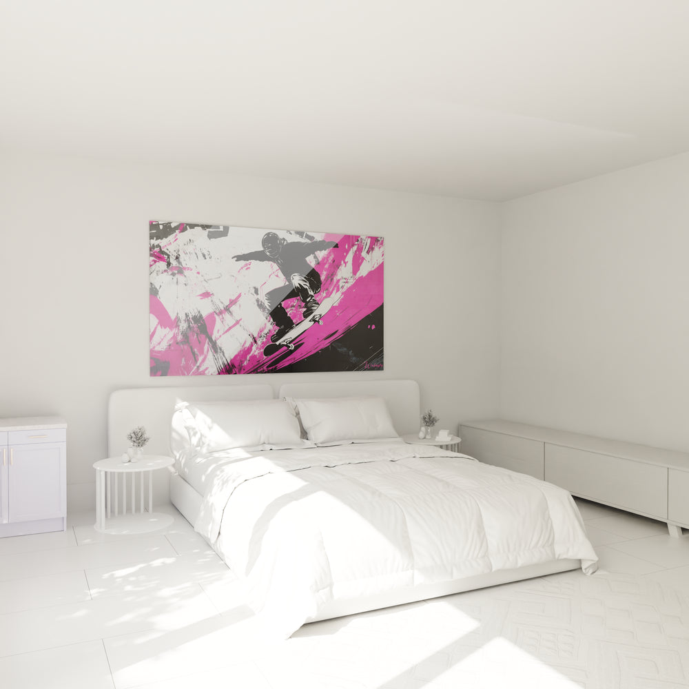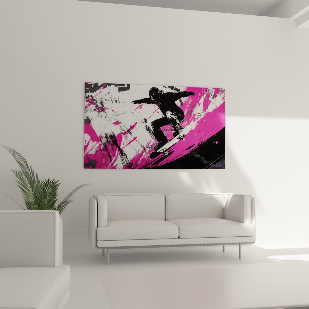 Ce tableau skateboard street art capture avec dynamisme un skateur en pleine figure sur un fond explosif rose et blanc. La silhouette noire en mouvement se détache parfaitement du fond éclaboussé de fuchsia vibrant, créant un contraste saisissant. L'œuvre frappe par son énergie cinétique et sa composition audacieuse qui évoque l'adrénaline du skateboard urbain. Les traits expressifs et les éclaboussures de peinture confèrent une impression de vitesse et de mouvement suspendu typique du street art contemporain.