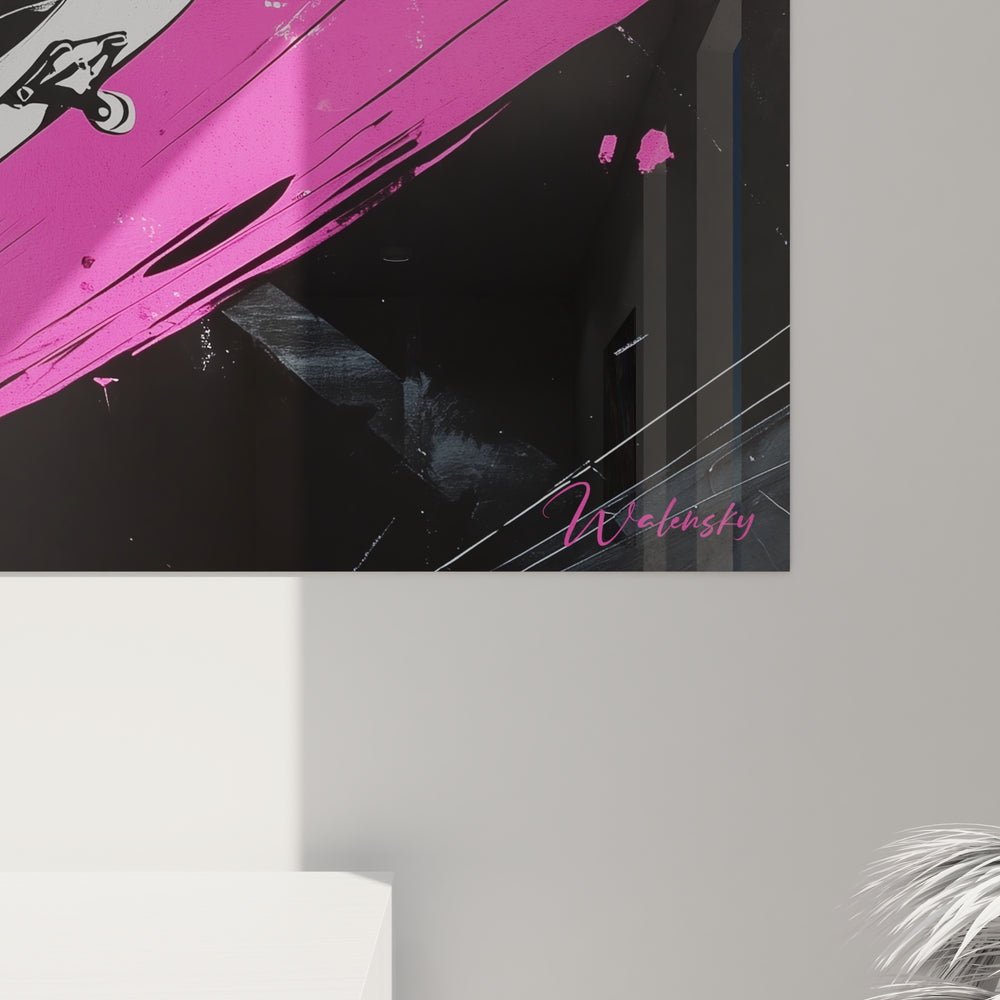 Imaginez l’instant suspendu où un skateur défie la gravité, pris dans son élan, silhouette noire contre un fond blanc délicatement patiné. Les éclats de rose fuschia viennent détonner avec intensité, rappelant les éclaboussures de peinture fraîche sur les murs des skateparks. Chaque détail révèle une histoire d’audace, d’équilibre et de dépassement personnel qui parle à votre sensibilité.