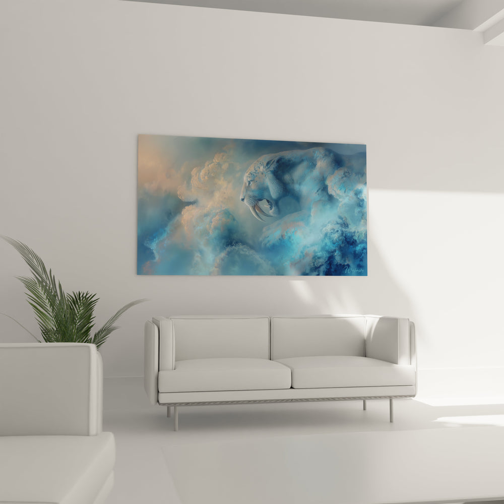 Ce tableau mural tigre à dent de sabre présente une vision spectaculaire d'un smilodon mystique évoluant majestueusement dans un environnement onirique de nuages bleus et dorés. L'artiste a magistralement capturé l'essence sauvage de ce félin préhistorique légendaire en le représentant dans un cadre surréaliste où la réalité se mêle au rêve. Le tigre à dents de sabre artistique semble flotter dans un océan de vapeurs colorées, créant une atmosphère mystérieuse et envoûtante. Les détails anatomiques du smilodon sont rendus avec une précision remarquable, depuis ses canines caractéristiques jusqu'à l'expression intense de son regard perçant. Cette œuvre d'art murale félin préhistorique transforme l'animal emblématique en créature mythologique, évoluant entre ciel et terre dans un paysage de nuages aux teintes changeantes. La composition équilibrée place le smilodon au centre de tourbillons nuageux qui semblent danser autour de sa silhouette puissante, créant un tableau décoratif tigre dent sabre d'une beauté saisissante. L'effet de transparence et les jeux de lumière confèrent à cette représentation artistique smilodon une dimension presque spirituelle, où l'animal ancestral devient gardien des nuages.