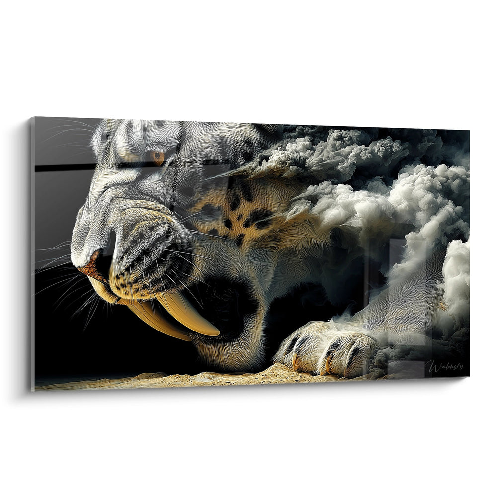 Ce tableau mural smilodon capture l'essence sauvage du plus redoutable prédateur préhistorique dans une scène d'une intensité saisissante. L'œuvre représente un tigre à dent de sabre en plein rugissement, sa gueule béante révélant ses légendaires canines acérées longues de plusieurs centimètres. Le smilodon fatalis est représenté avec un réalisme époustouflant, chaque détail anatomique étant minutieusement rendu pour créer une décoration murale féline d'exception. Les traits caractéristiques de ce félin préhistorique sont magnifiés : la musculature puissante des mâchoires, les vibrisses tactiles, et surtout ces crocs impressionnants qui ont fait la réputation de l'espèce. L'arrière-plan dramatique, composé de nuages tourmentés et de brume mystérieuse, évoque l'atmosphère primordiale de l'ère glaciaire. Cette toile prédateur préhistorique transforme n'importe quel espace en galerie d'art paléontologique, offrant une fenêtre fascinante sur un monde disparu. Le rendu artistique allie précision scientifique et vision créative, créant un art mural animal sauvage qui captive autant les passionnés de paléontologie que les amateurs d'art animalier contemporain.