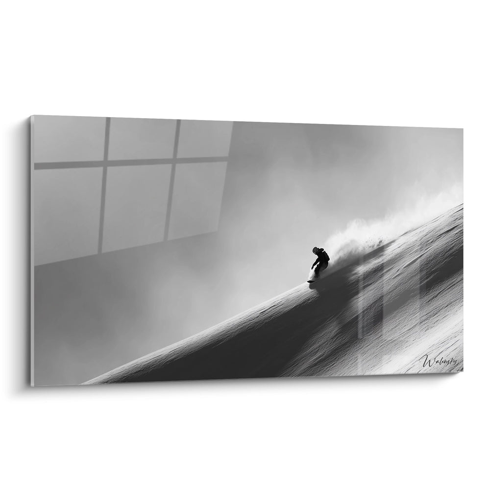 Cette œuvre d'art murale saisissante capture l'essence pure du snowboard en montagne à travers une photographie noir et blanc d'une intensité remarquable. L'image présente un snowboardeur solitaire dévalant une pente enneigée dans un nuage de poudreuse éclatante, créant une composition dynamique où le mouvement et la vitesse sont palpables. La technique photographique utilisée met en valeur les contrastes dramatiques entre les zones d'ombre et de lumière, sublimant la texture de la neige soulevée par la descente. Le rideur, silhouetté contre le paysage montagnard, incarne parfaitement l'esprit de liberté et d'aventure qui caractérise les sports de glisse. Cette image évoque la sensation grisante de la glisse en poudreuse fraîche, moment privilégié pour tout amateur de snowboard. La composition minimaliste mais puissante transforme cet instant fugace en une œuvre d'art intemporelle qui saura inspirer les passionnés de montagne et de sensations fortes.