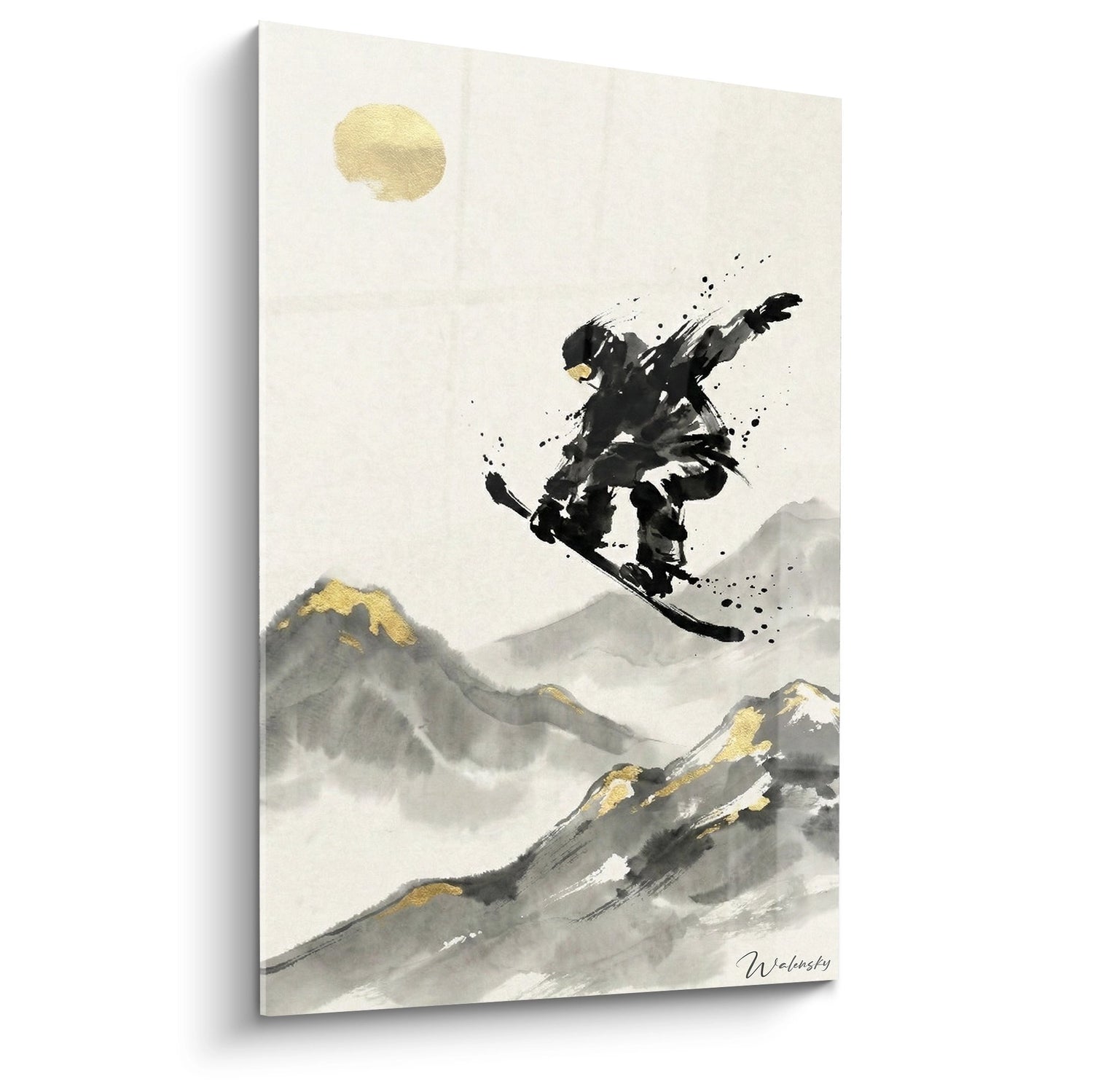 Cette œuvre d'art murale capture l'essence du snowboard à travers un prisme artistique unique, fusionnant l'adrénaline du sport de glisse avec l'esthétique raffinée de la peinture traditionnelle japonaise. Le tableau présente un snowboarder en plein vol, figé dans un moment de pure liberté au-dessus d'un paysage montagneux majestueux. L'artiste a utilisé une technique de pinceau expressif rappelant l'encre de Chine, créant des éclaboussures dynamiques qui traduisent parfaitement le mouvement et l'énergie du rider. Les montagnes se dessinent en arrière-plan avec des nuances de gris subtiles, ponctuées de touches dorées qui évoquent les reflets du soleil sur la neige fraîche. Cette représentation minimaliste mais puissante transforme une scène de sport extrême en véritable méditation visuelle, parfaite pour habiller un salon moderne ou une chambre d'amateur de glisse.