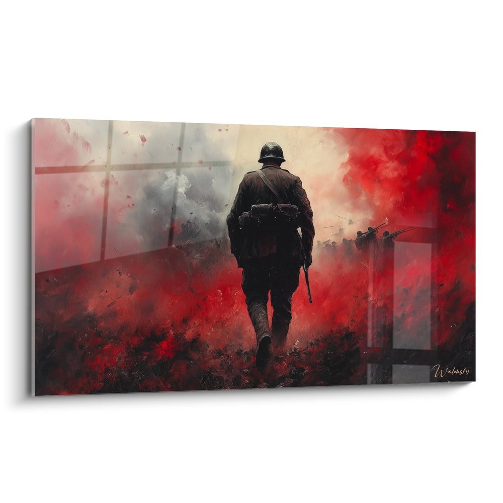Ce tableau soldat présente une composition dramatique d'une intensité visuelle saisissante. L'œuvre capture un militaire isolé marchant à travers un paysage dévasté, baigné dans une atmosphère rouge sang particulièrement évocatrice. Le tableau soldat solitaire se détache par son sujet central positionné au premier plan, créant un contraste puissant avec l'arrière-plan apocalyptique. Les nuages de fumée et les débris voltigeant dans l'air renforcent l'aspect tragique de cette décoration murale militaire. La signature visible en bas à droite authentifie cette œuvre d'art contemporaine qui transforme un thème historique en expression artistique moderne.