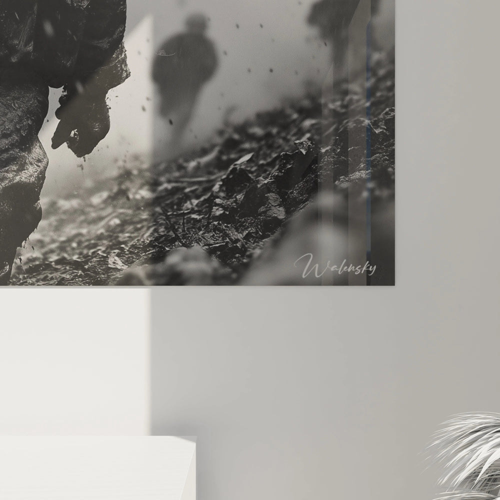 Cette œuvre saisissante présente un tableau soldat d'une intensité dramatique remarquable, capturant un moment de tension militaire dans une composition monochrome puissante. L'image dévoile un combattant en tenue de guerre complète, portant un casque militaire caractéristique et un uniforme de combat détaillé. La scène se déroule dans un environnement hostile où la poussière et les débris créent une atmosphère de chaos contrôlé. Ce tableau soldat guerre dramatique exprime la réalité brute du conflit à travers des contrastes visuels saisissants et une texture photographique exceptionnelle.