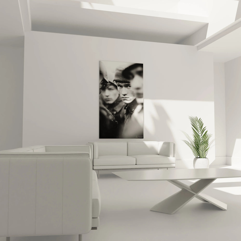 Cette œuvre saisissante présente un tableau soldat d'une intensité remarquable, capturant l'essence même du sacrifice militaire à travers une esthétique noir et blanc profondément évocatrice. Le tableau soldat première guerre mondiale révèle un jeune homme en uniforme, dont le regard intense transperce l'objectif avec une gravité qui témoigne des épreuves endurées. Cette décoration murale soldat se distingue par sa capacité à transmettre l'émotion brute du conflit, transformant un simple portrait en véritable symbole de mémoire collective. Les détails du casque militaire et la texture granuleuse de l'image confèrent à cette œuvre une authenticité troublante qui marque profondément l'observateur.