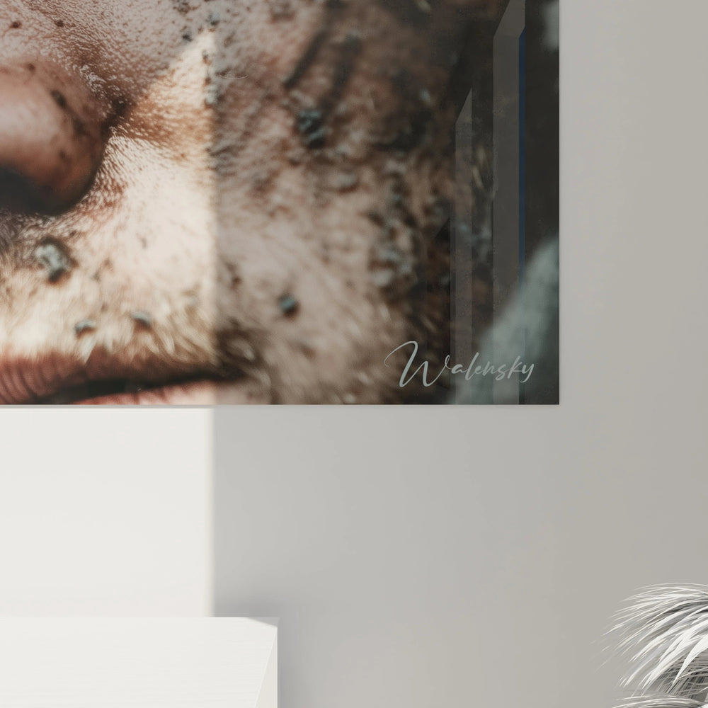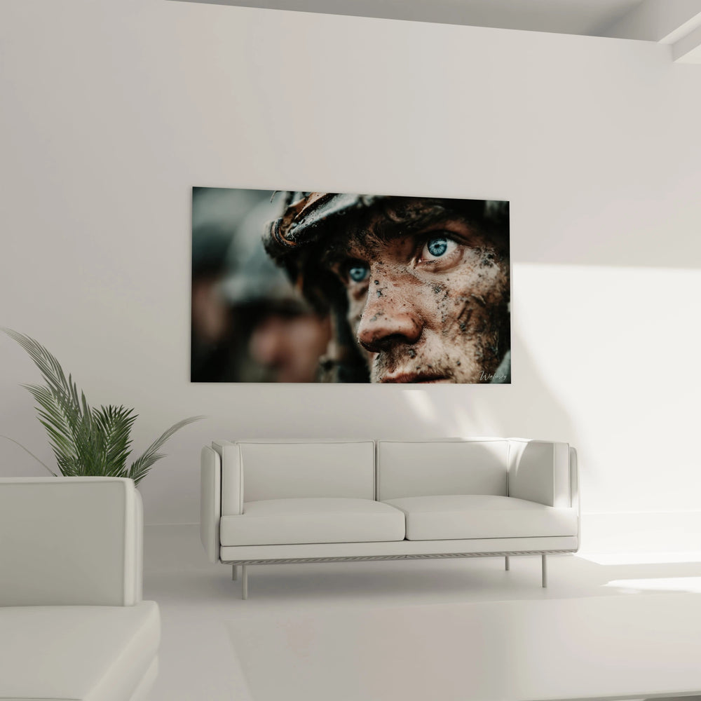 Ce tableau soldat première guerre mondiale capture l'essence dramatique d'un combattant marqué par les tranchées. Le regard perçant aux yeux bleus traverse l'objectif avec une intensité saisissante, révélant la profondeur psychologique du conflit. La boue et la saleté qui recouvrent son visage témoignent de la réalité brutale du front, créant un contraste frappant avec l'éclat de son regard. Cette décoration murale soldat authentique présente des détails d'un réalisme troublant, où chaque trace de terre raconte une histoire. L'expression figée du personnage évoque la détermination et l'épuisement mêlés. Le casque militaire sombre encadre parfaitement le visage, créant une composition équilibrée qui attire immédiatement l'attention sur les éléments humains de cette œuvre bouleversante.