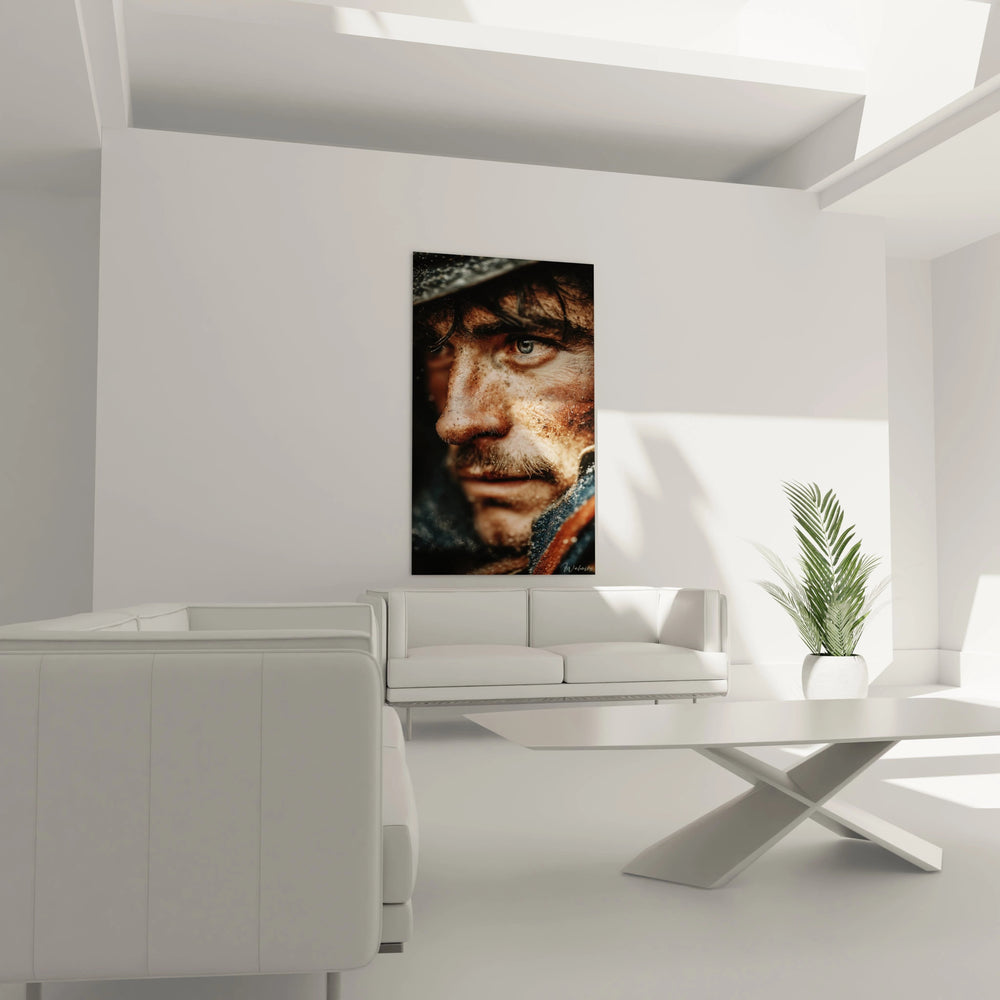 Ce tableau soldat révèle un portrait saisissant d'intensité émotionnelle. L'œuvre capture un visage masculin dont les traits sont marqués par la fatigue et l'expérience. Le regard perçant aux iris bleus-gris constitue l'élément focal central de cette composition. Les détails de la peau révèlent une texture rugueuse, parsemée de taches et de marques qui témoignent d'une vie rude. L'artiste a su créer une œuvre où chaque détail facial raconte une histoire. Ce tableau soldat regard intense frappe par son réalisme photographique et sa capacité à transmettre une émotion profonde dès le premier regard.