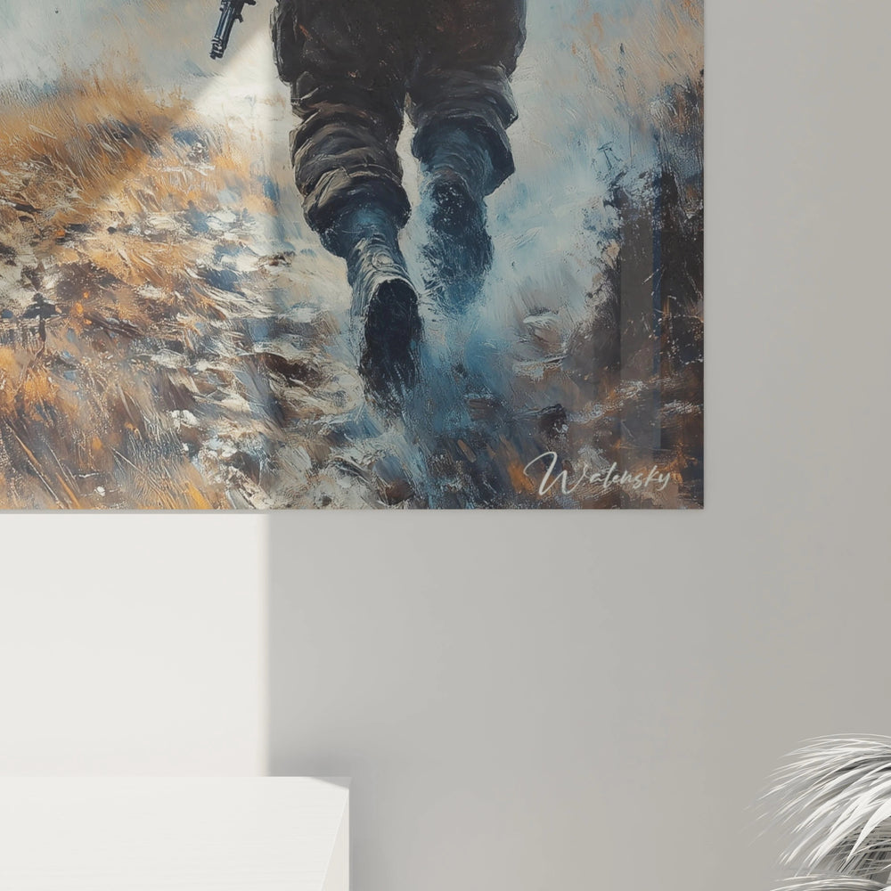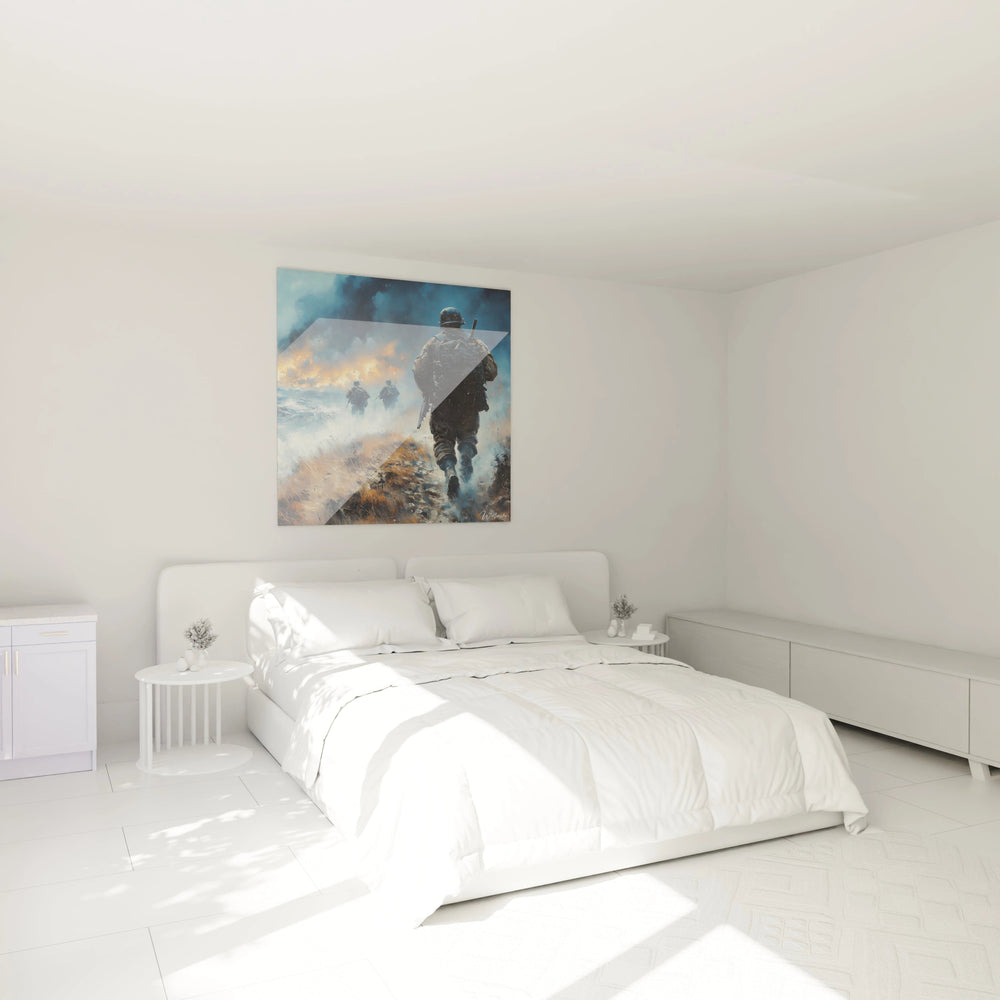 Cette œuvre saisissante présente un tableau soldats dans une scène de combat intense où trois militaires progressent à travers un paysage dévasté par la guerre. Le tableau soldats combat héroïque capture un moment de bravoure authentique avec des détails visuels remarquables. Au premier plan, un soldat équipé d'un casque militaire et d'un sac à dos impose sa présence monumentale, tandis que deux autres figures se profilent dans la brume de bataille. Cette décoration murale soldats évoque immédiatement l'atmosphère dramatique des conflits armés à travers des contrastes visuels puissants entre les flammes orangées qui embrasent l'horizon et les tons froids du ciel chargé de fumée.