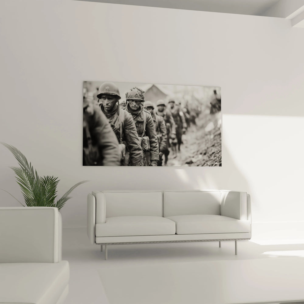 Ce tableau soldats présente une scène militaire d'une intensité remarquable, capturant l'essence même du conflit armé à travers une composition en noir et blanc. L'œuvre révèle un groupe de combattants en uniforme, leurs visages marqués par la fatigue et la détermination. Le tableau soldats guerre se distingue par son réalisme saisissant, où chaque détail vestimentaire témoigne de l'authenticité historique. La profondeur de champ maîtrisée place le personnage central en évidence, créant une hiérarchie visuelle qui guide naturellement le regard. Cette décoration murale soldats évoque immédiatement l'atmosphère pesante des champs de bataille, transformant l'espace d'exposition en un lieu de mémoire et de réflexion sur les sacrifices humains.