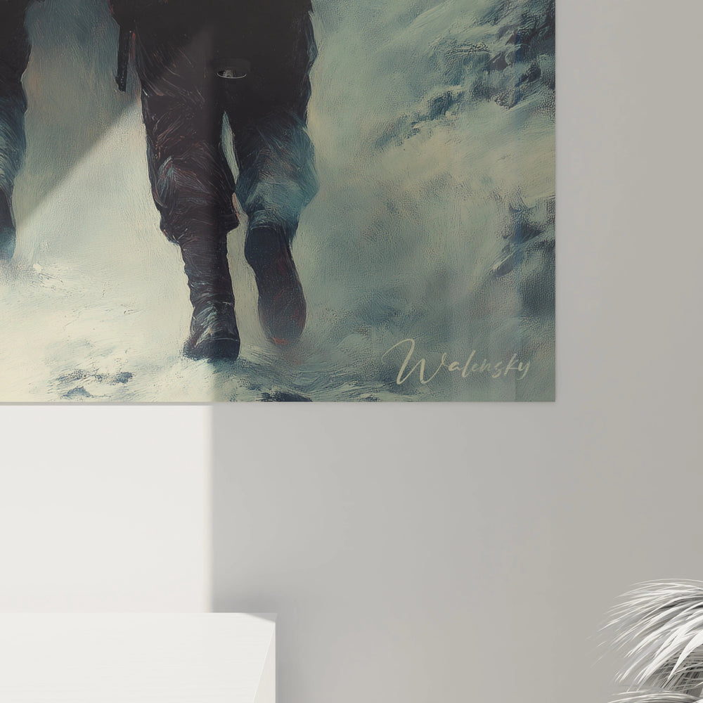 L'expérience visuelle de ce tableau soldats se transforme selon la distance d'observation, révélant une richesse de détails remarquable. À distance, l'œuvre impose sa force dramatique par ses contrastes chromatiques et sa composition théâtrale. L'examen rapproché dévoile la finesse du travail sur les textures : les plis des uniformes, la patine des équipements, les variations subtiles dans la surface neigeuse. Ce tableau soldats détails minutieux récompense l'observateur attentif par une profusion d'éléments narratifs : traces dans la neige, reflets sur les casques, variations dans les postures individuelles. Cette richesse visuelle garantit une contemplation renouvelée à chaque regard, caractéristique des grandes œuvres d'art mural soldats qui marquent durablement l'esprit.