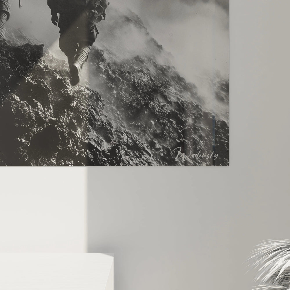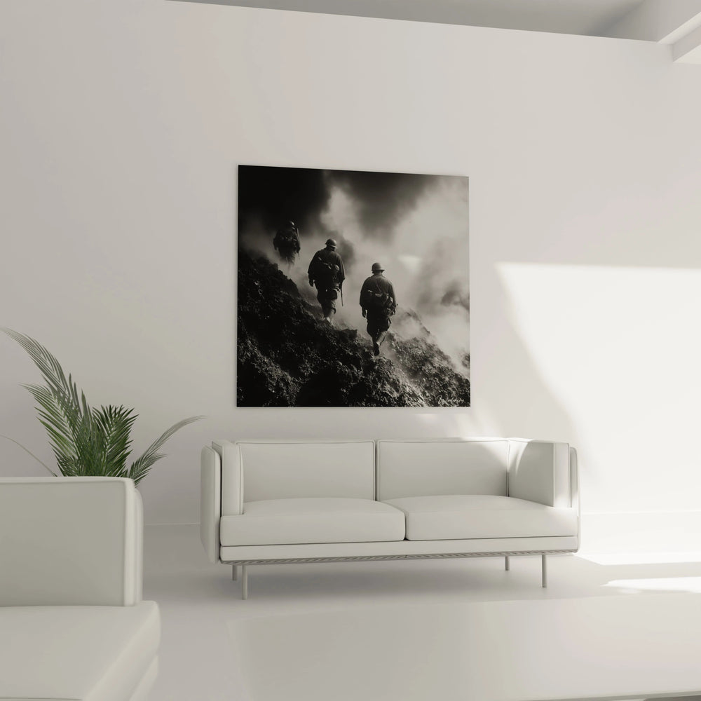 Ce tableau soldats révèle une composition dramatique en noir et blanc qui capture l'essence même du conflit militaire. L'œuvre présente trois figures militaires évoluant dans un paysage rocheux enveloppé d'une atmosphère mystérieuse. La fumée ou brume qui entoure les personnages crée une ambiance particulièrement saisissante, typique d'un tableau soldats fumée dramatique. Les casques militaires se détachent nettement sur le fond nuageux, offrant une lecture immédiate du sujet. Cette décoration murale soldats monochrome développe une esthétique puissante où chaque élément visuel contribue à l'intensité narrative de l'ensemble.