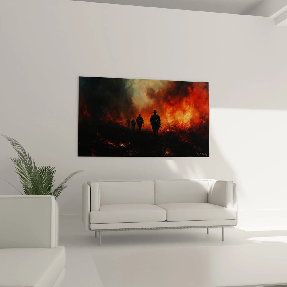 Ce tableau soldats dépeint une scène militaire saisissante où quatre silhouettes de combattants se détachent contre un paysage embrasé d'une intensité dramatique extraordinaire. L'œuvre capture l'essence de la guerre à travers un contraste puissant entre l'obscurité des figures humaines et l'explosion chromatique d'un brasier qui consume tout l'arrière-plan. Cette décoration murale soldats dramatique transforme l'espace par sa force émotionnelle brute, créant une atmosphère de tension et de sacrifice héroïque. Les casques militaires caractéristiques et les silhouettes armées ancrent immédiatement l'observateur dans un contexte historique militaire précis.