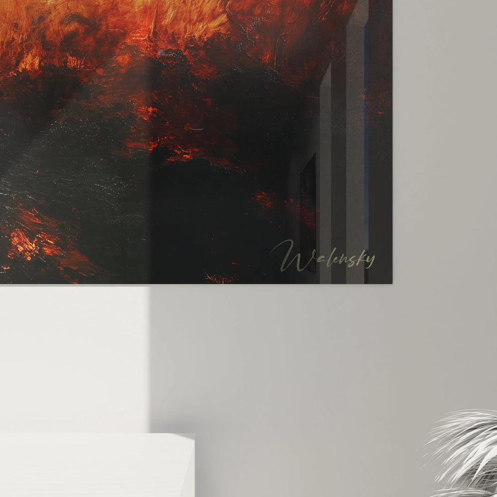 La palette chromatique de ce tableau soldats flammes rouges repose sur un contraste saisissant entre les noirs profonds et les oranges incandescents. Les teintes dominantes évoluent du rouge vermillon au orange cuivré, créant une progression thermique qui évoque la chaleur intense d'un brasier authentique. Cette art mural soldats couleurs dramatiques incorpore subtilement des nuances de brun terreux et de gris fumée qui enrichissent la complexité visuelle. Les variations chromatiques incluent :