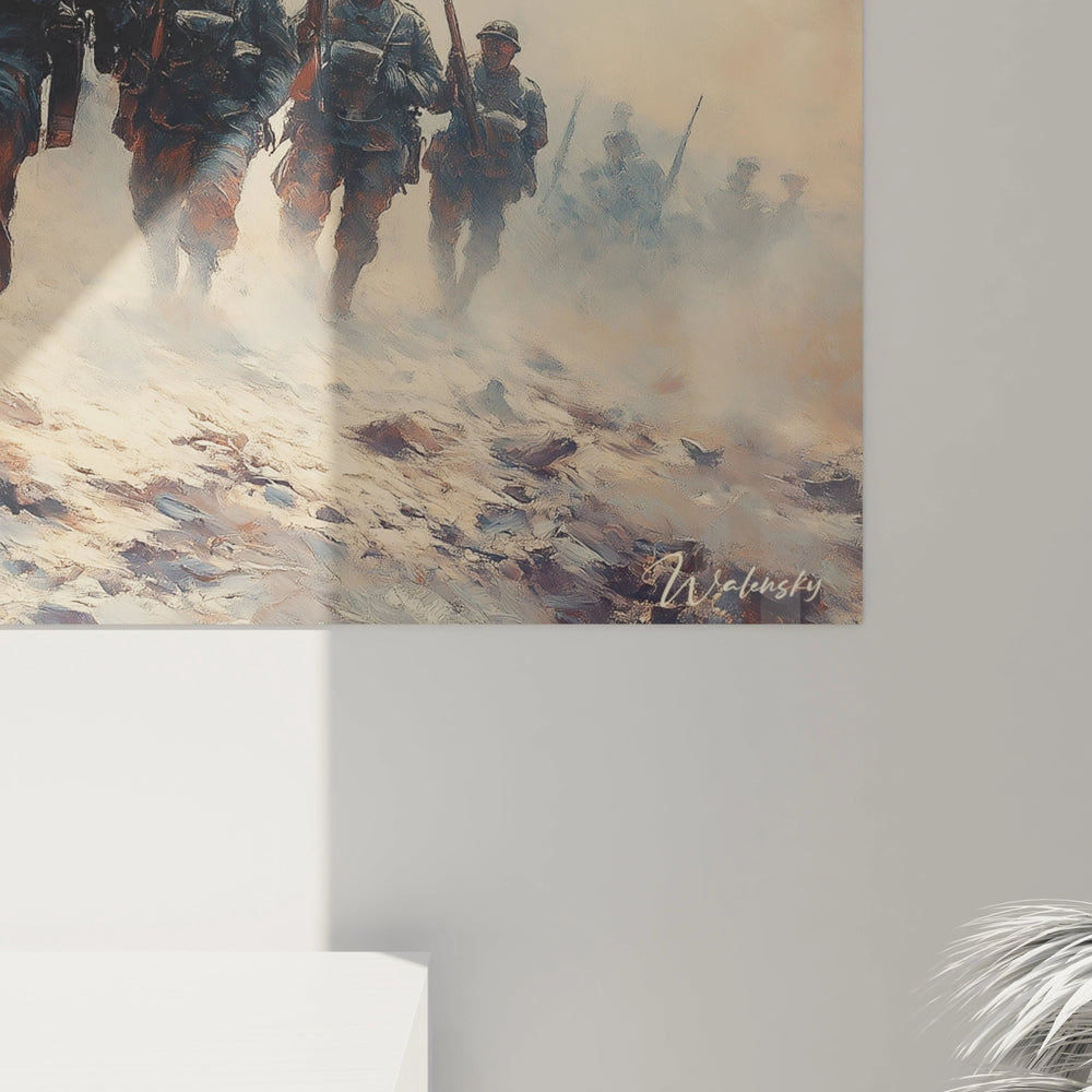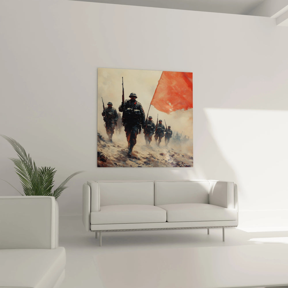 Ce tableau soldats saisit un moment de bravoure militaire où une colonne de combattants avance dans un paysage désolé sous un drapeau rouge éclatant. L'œuvre révèle immédiatement sa puissance dramatique par le contraste saisissant entre les uniformes sombres des militaires et l'étendard vermillon qui flotte au-dessus d'eux. Cette décoration murale soldats héroïques capture l'essence de la détermination humaine face à l'adversité, avec un réalisme pictural qui transforme chaque observateur en témoin silencieux de cette marche historique. Les détails minutieux des équipements et la gestuelle naturelle des personnages créent une authenticité troublante qui distingue cette création des représentations conventionnelles du genre militaire.
