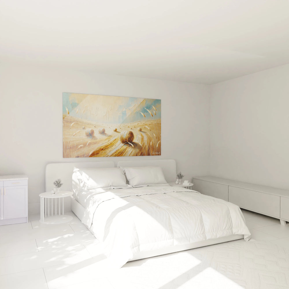 Inspiré des maîtres impressionnistes, ce tableau puise sa force dans la représentation sensible du paysage rural, où les saisons rythment un éternel renouvellement. Il raconte la beauté du cycle agricole avec ses efforts récompensés, sa paix pleine de promesses, et incarne un hommage vibrant à cet attachement profond entre la terre et l’homme.