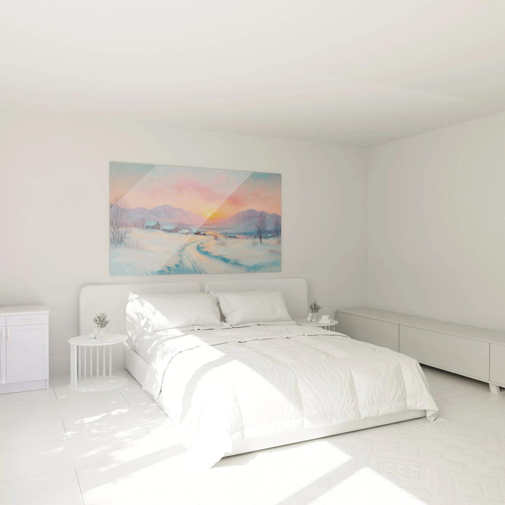 L'unicité de ce tableau paysage hivernal avec soleil couchant réside dans sa capacité à transformer un paysage froid en une expérience visuelle chaleureuse. Les arbres dénudés qui ponctuent la composition créent des silhouettes élégantes contre le ciel embrasé, ajoutant une dimension graphique à l'ensemble. Le contraste entre la tranquillité du village endormi et l'explosion chromatique du ciel crée une tension visuelle fascinante. Cette décoration murale paysage hivernal se distingue par sa capacité à évoquer simultanément la solitude paisible et la magnificence de la nature.