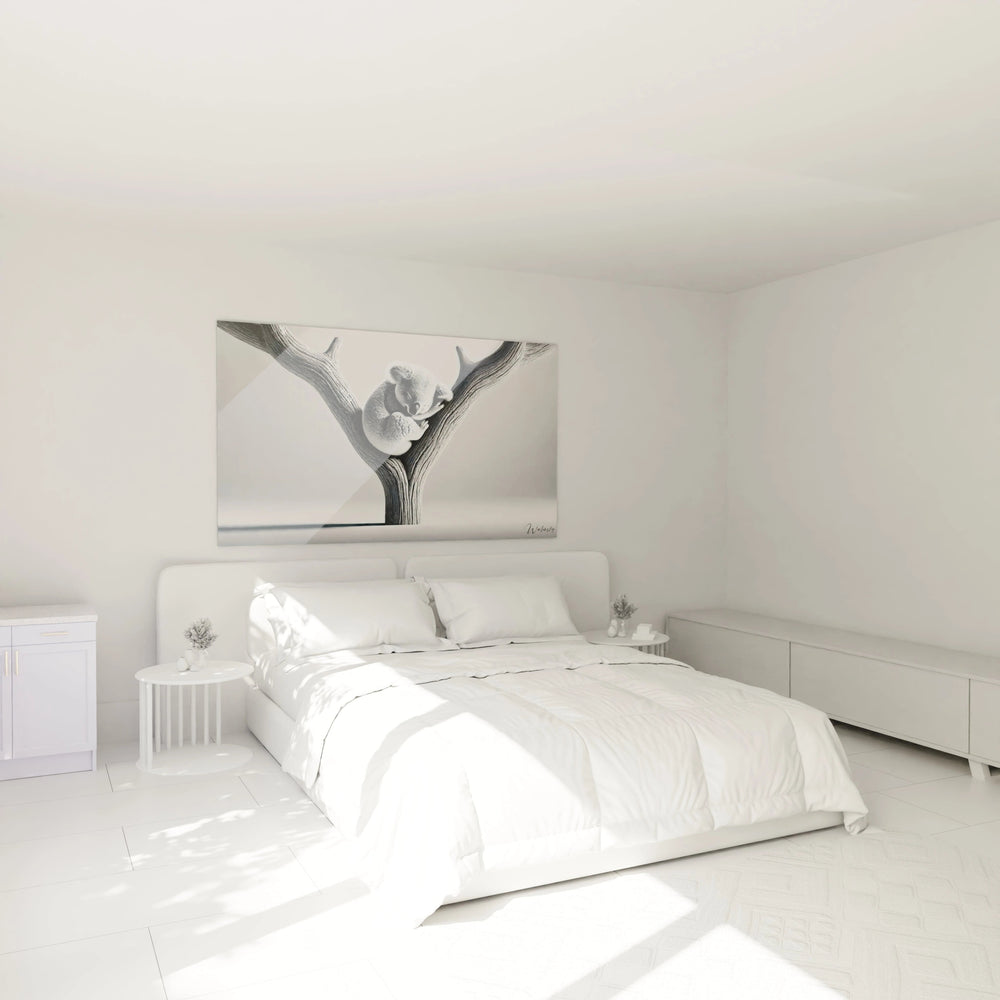 Ce tableau sublime la délicatesse d’un koala endormi, blotti contre un tronc d’arbre formant un véritable berceau naturel. Les courbes douces et enveloppantes du sujet, magnifiées par une palette monochrome subtile en nuances de blanc, gris et noir, offrent une expérience visuelle apaisante. Il inspire une sensation immédiate de tranquillité, idéale pour créer une ambiance propice au repos et à la méditation.
