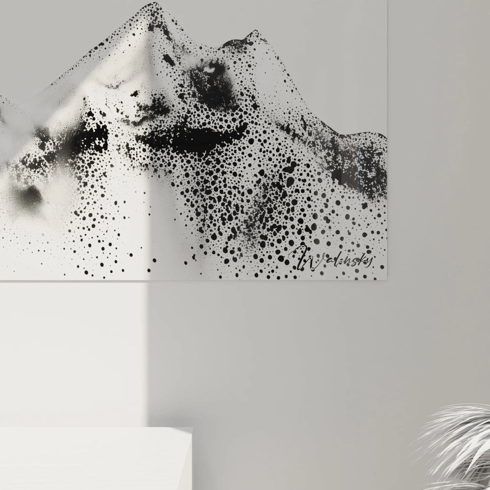 La palette chromatique de ce tableau montagne monochrome repose sur un contraste radical entre le noir profond et le blanc pur. Cette dualité chromatique renforce l'impact visuel de l'œuvre tout en évoquant les contrastes naturels des paysages enneigés. Les nuances de gris émergent naturellement de la densité variable des points, créant des transitions subtiles entre lumière et ombre. Cette œuvre montagne minimaliste tire sa force expressive de cette restriction volontaire, où chaque point noir acquiert une valeur particulière.