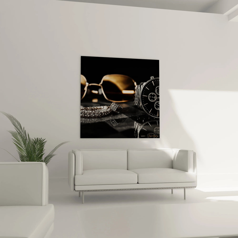 Ce tableau mural accessoires capture l'essence même du raffinement contemporain à travers une composition magistrale d'accessoires de mode haut de gamme. L'œuvre présente une montre de prestige aux multiples cadrans, symbole de l'excellence horlogère, dont les aiguilles et les détails métalliques reflètent une précision artisanale remarquable. Les lunettes de soleil aux verres dégradés bronze-doré constituent un élément central de cette composition, leur design épuré incarnant l'élégance moderne. Un bracelet orné de cristaux scintillants serpente avec grâce, créant des jeux de lumière fascinants qui évoquent le luxe discret. La bague sertie de pierres précieuses complète harmonieusement cet ensemble, témoignant de l'art joaillier traditionnel. L'arrière-plan noir profond sublime chaque accessoire, créant un contraste saisissant qui révèle la beauté de chaque matière noble. La surface réfléchissante amplifie la dimension esthétique de l'œuvre, doublant visuellement la richesse de la composition. Cette représentation artistique transforme de simples accessoires en véritables objets d'art, célébrant l'union parfaite entre fonctionnalité et beauté. L'éclairage subtil révèle les textures variées et les finitions délicates, créant une atmosphère à la fois mystérieuse et sophistiquée qui caractérise l'univers du luxe contemporain. Ce tableau mural mode s'impose comme une décoration murale haut de gamme parfaite pour les intérieurs raffinés.