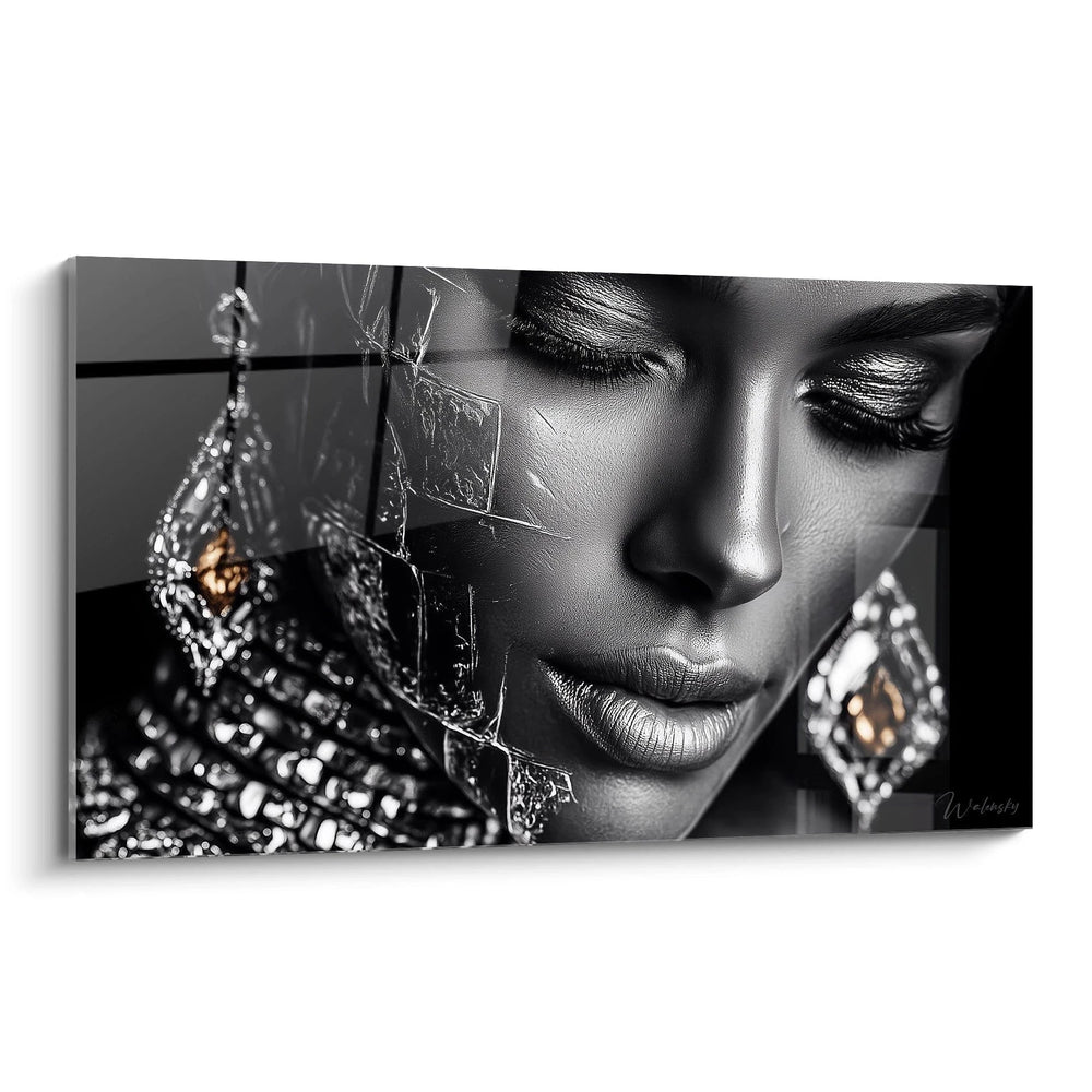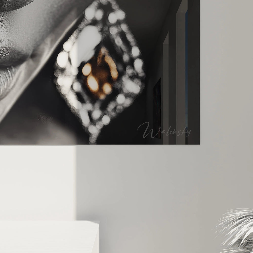Ce tableau mural accessoires de mode représente un portrait artistique d'une femme d'une beauté saisissante, photographiée dans un style noir et blanc dramatique qui évoque l'univers de la haute couture. L'œuvre capture un moment d'intense sophistication où le modèle porte un masque facial géométrique aux reflets métalliques, créant un jeu de lumières et d'ombres particulièrement captivant. Ses boucles d'oreilles volumineuses, vraisemblablement ornées de cristaux ou de diamants, encadrent délicatement son visage et ajoutent une dimension luxueuse à l'ensemble. Le maquillage sophistiqué est travaillé avec une précision remarquable : les lèvres brillantes et les cils sublimés créent un contraste saisissant avec la monochromie générale de l'image. La composition photographique met l'accent sur les accessoires de mode féminins, transformant ces éléments en véritables protagonistes de l'œuvre. Les jeux d'ombres et de lumières sculptent les traits du visage, créant une atmosphère mystérieuse et élégante qui évoque les plus grandes campagnes de mode contemporaines. Cette représentation transcende la simple photographie pour devenir une véritable œuvre d'art murale moderne, parfaite pour sublimer un intérieur design contemporain et sophistiqué.