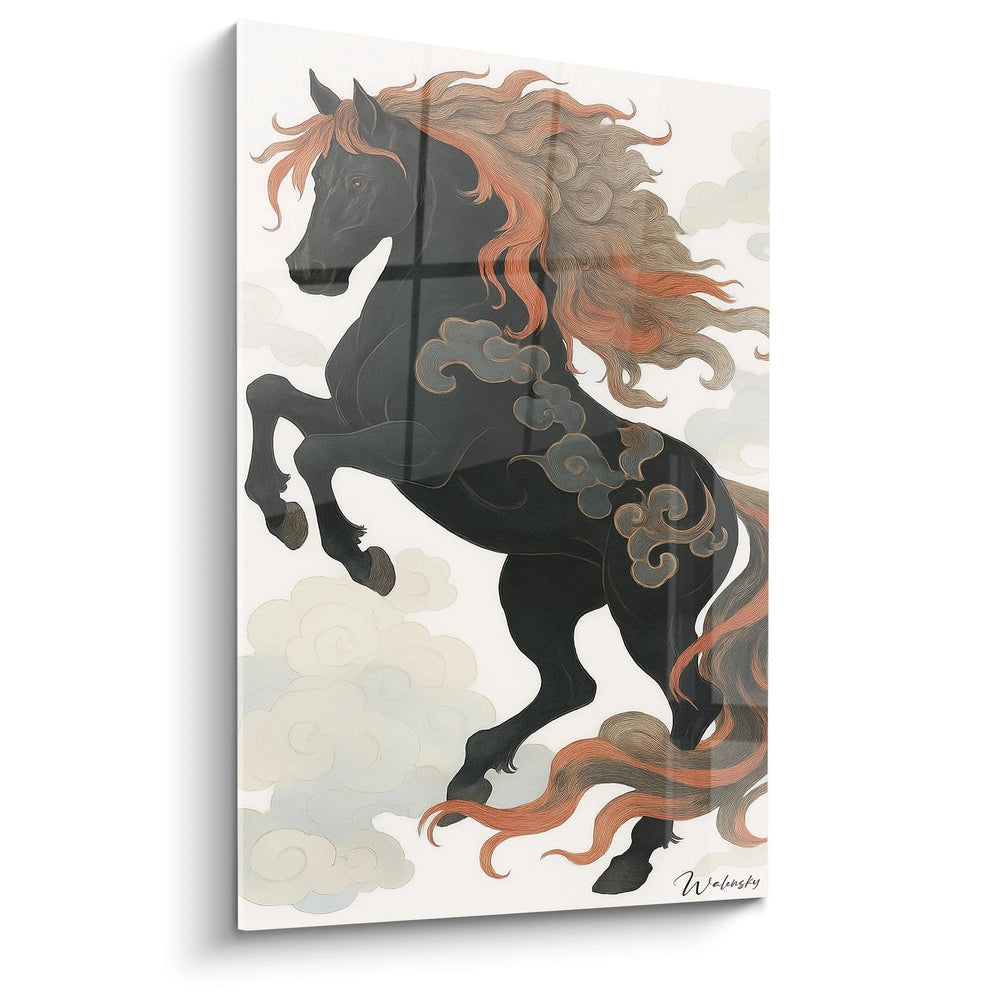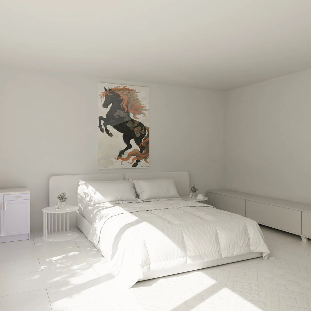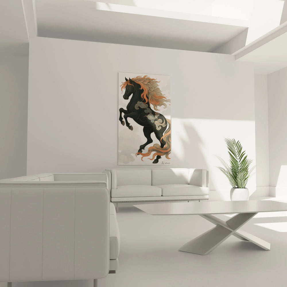 Ce tableau est une invitation à vivre l’intensité d’un moment hors du temps, où un cheval s’élance fièrement entre les nuages, emblème ancestral de force, noblesse et liberté. Les lignes s’entrelacent avec fluidité, capturant à la fois la grâce et la puissance indomptable de cet être mythique. Chaque regard posé révèle le subtil équilibre entre l’obscurité noble du noir profond et la flamme vibrante de la crinière aux tons orangés, créant un spectacle visuel qui évoque un souffle vivant au cœur de votre espace.