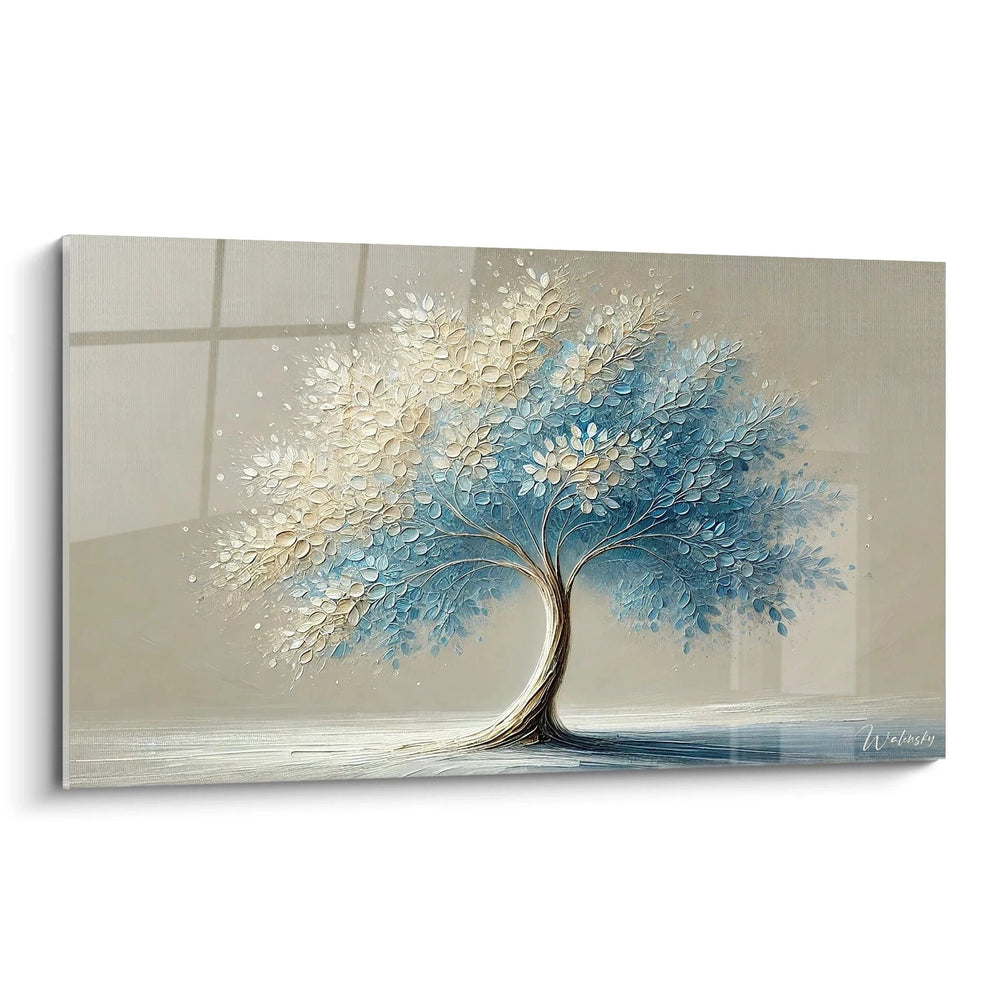 Conçu pour révéler l’équilibre fragile entre ombre et clarté, cet arbre unique incarne la dualité de la vie. Ses branches fines et aériennes s’étirent délicatement, caressées par des feuilles aux textures vaporeuses, réalisées avec une finesse rappelant le mouvement d’une brise légère. Les teintes choisies – bleu, beige et blanc – s’entrelacent harmonieusement, créant une atmosphère où fraîcheur et chaleur se rencontrent dans une symphonie visuelle apaisante.