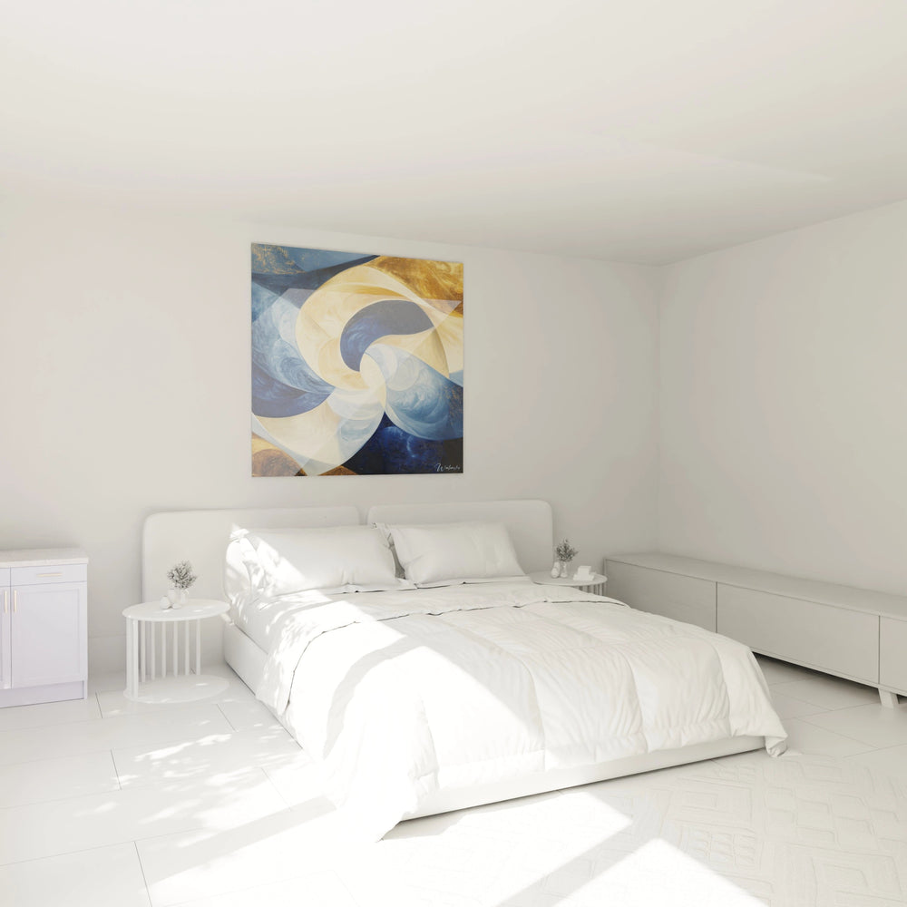 Ce tableau spirale captive immédiatement par son mouvement tourbillonnant hypnotique qui guide l'œil vers le centre de la composition. L'œuvre présente une dynamique circulaire puissante où les formes organiques s'entremêlent dans une danse visuelle perpétuelle. Le tableau spirale abstraite moderne révèle une harmonie parfaite entre les tons dorés chaleureux et les nuances bleues profondes, créant un contraste saisissant qui évoque à la fois la terre et le ciel. Cette décoration murale spirale contemporaine transforme l'espace par sa présence magnétique et son énergie tourbillonnante qui semble défier les lois de la statisme artistique traditionnel.