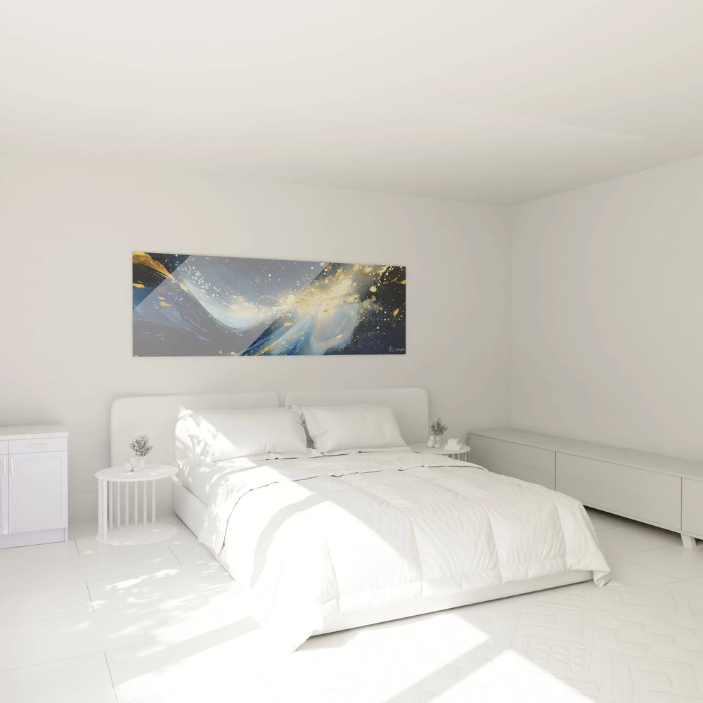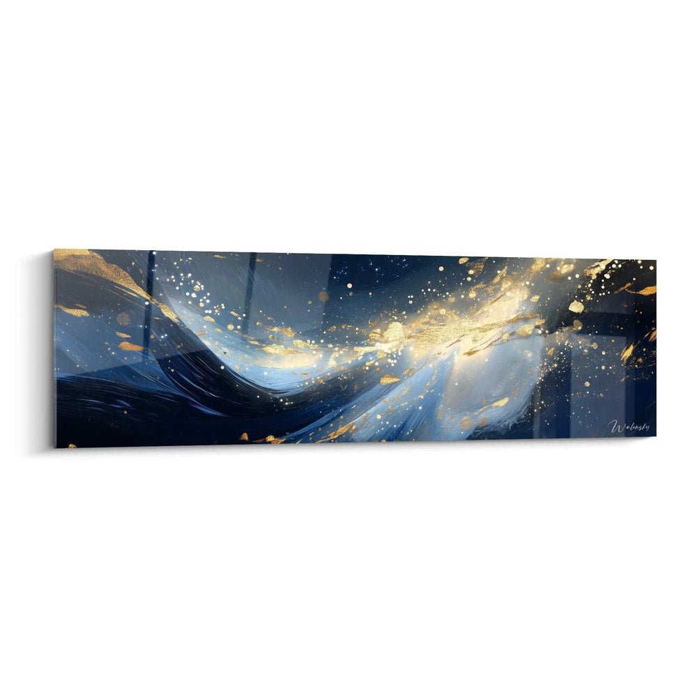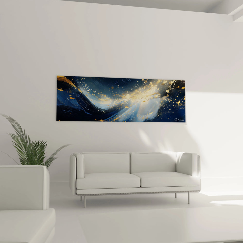 Ce magnifique tableau galaxie se distingue par sa composition abstraite aux teintes cosmiques profondes. L'œuvre révèle immédiatement un univers mystérieux où dominent les bleus océaniques et les dorés scintillants. Cette tableau galaxie moderne abstrait capture l'essence d'un cosmos en mouvement, avec des particules lumineuses qui dansent à travers l'espace pictural. Les éclaboussures dorées créent un contraste saisissant contre les profondeurs azurées, évoquant instantanément la majesté d'une nébuleuse lointaine. Chaque détail de ce tableau galaxie étoilé transporte le regard vers l'infini, créant une expérience visuelle contemplative et apaisante qui transforme immédiatement l'atmosphère d'un espace.