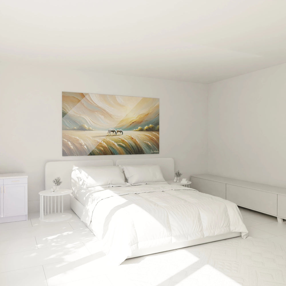 En exposant ce tableau, vous créez instantanément un refuge visuel. Les nuances chaudes de beige et de jaune, mêlées à un bleu délicat, illuminent subtilement la pièce tout en insufflant une atmosphère douce et enveloppante. Vous aurez l'impression que le souffle du vent anime encore les courbes fluides du paysage, tandis que le jeu des couleurs évoque un coucher de soleil tendre, empreint de calme et d’équilibre.