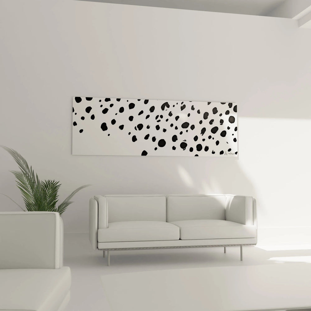La palette chromatique de ce tableau taches minimaliste repose sur le contraste absolu entre le noir profond et le blanc pur. Cette dualité chromatique crée un impact visuel saisissant qui transcende la simplicité apparente. Les tons noirs varient subtilement en intensité, certaines taches présentant des nuances plus sombres que d'autres.