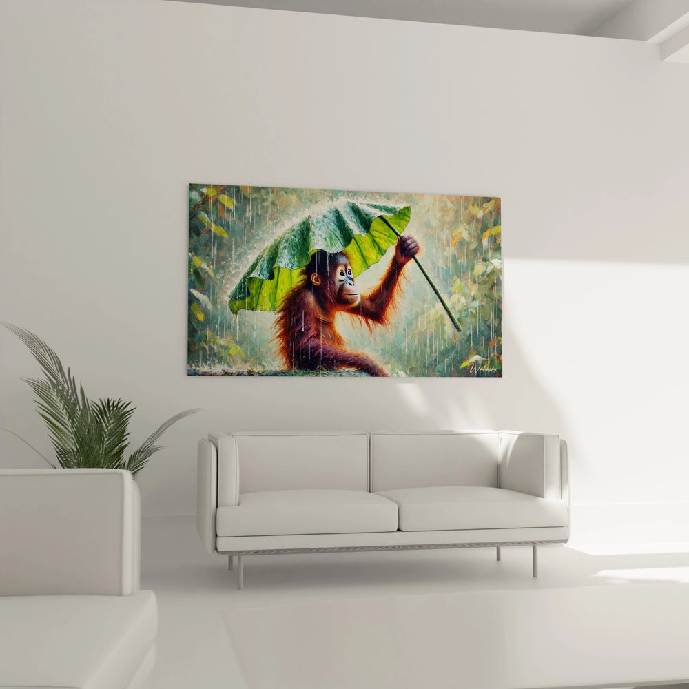 Imaginez un instant la fraîcheur d’une pluie douce caressant une forêt luxuriante, tandis qu’un petit singe ingénieux trouve refuge sous une grande feuille de bananier. Ce tableau unique capture cette scène avec une sensibilité rare, vous offrant bien plus qu’une simple décoration : une véritable immersion sensorielle et émotionnelle dans la beauté de la nature.