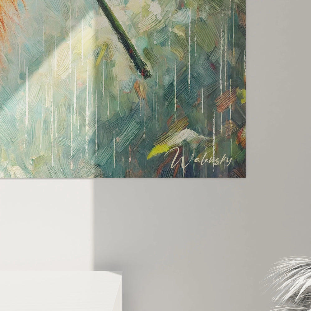 Entre réalisme et touches expressives, la texture de l’œuvre invite votre regard à danser au rythme des gouttes, à sentir la fraicheur de l’averse et à admirer les détails soignés du pelage du singe. C’est une expérience visuelle qui enchante et calme, transformant votre pièce en un havre de paix inspiré par la nature sauvage.