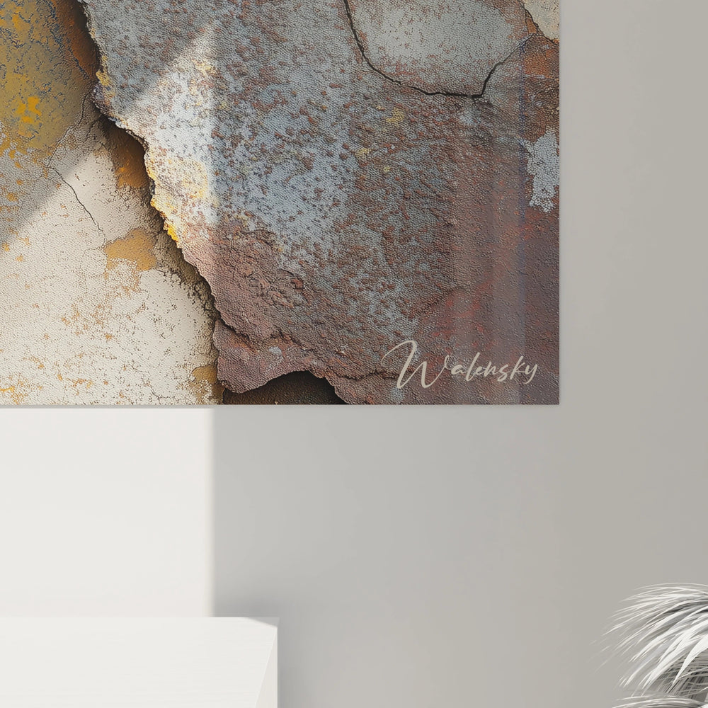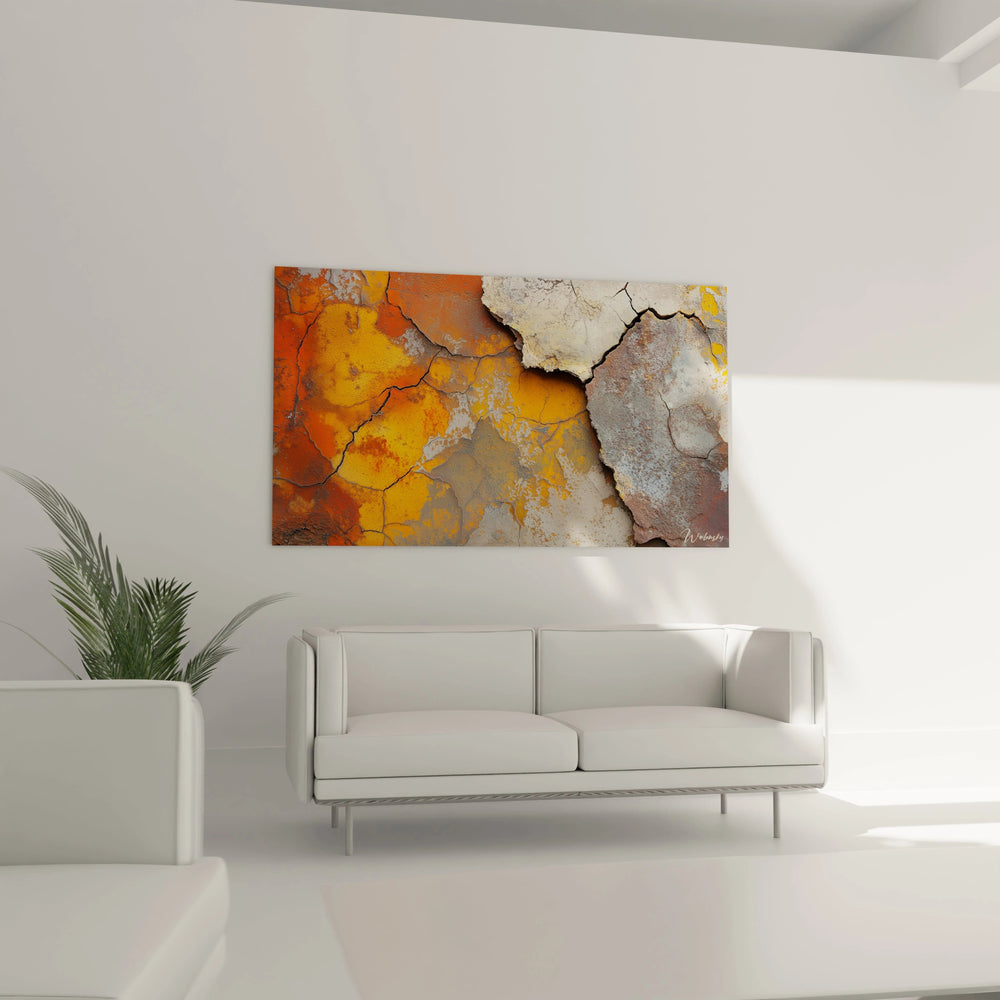 Chaque détail de ce tableau est une invitation à explorer ce que cache la surface. Les cassures, les reliefs, les nuances chaudes d’orange et de jaune se mêlent aux tons plus profonds de gris et de rouge, recréant un univers où le temps laisse ses empreintes. Cette œuvre emprunte à la nature et aux vestiges anciens pour conter une histoire de transformation — celle où la dégradation devient éclat, où l’imperfection se révèle sublime.