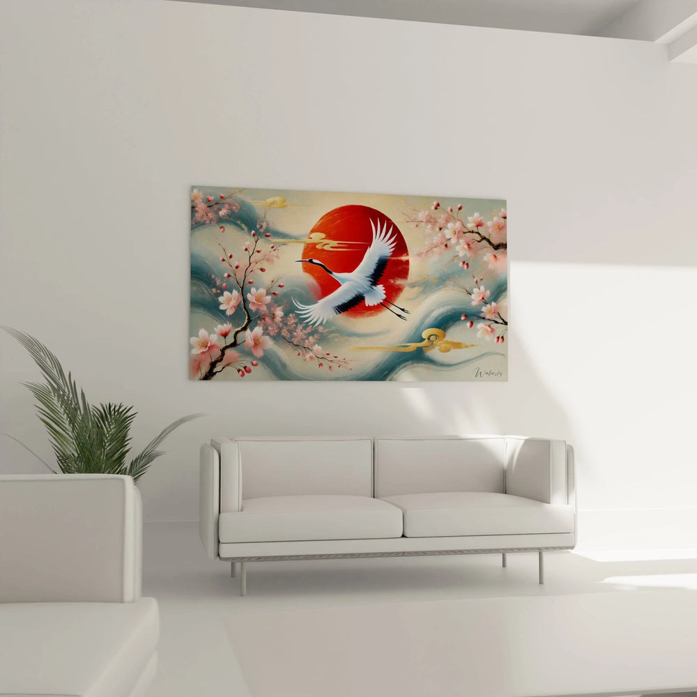 Ce tableau est bien plus qu’une simple décoration : c’est une expérience sensorielle qui évoque la philosophie japonaise de la beauté fugace. La silhouette élégante de la grue symbolise la liberté paisible, tandis que les cerisiers en fleurs rappellent la douceur éphémère des instants précieux. La chaude lueur du soleil rougeoyant à l’horizon sert de point d’ancrage, éveillant en vous une sensation profonde d’apaisement et de connexion avec la nature.