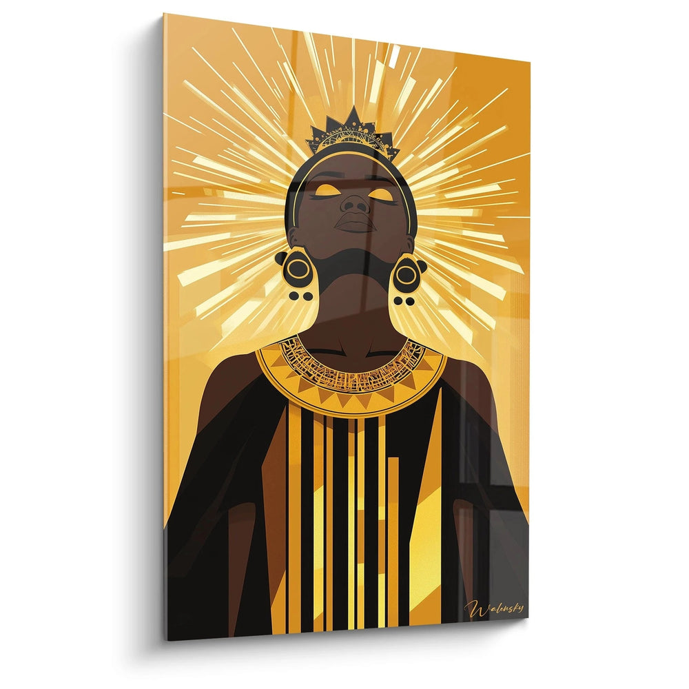 Ce tableau reine présente une œuvre d'art captivante mettant en scène une femme africaine majestueuse au centre d'une composition rayonnante. L'œuvre se distingue par sa palette chromatique dominée par les tons dorés et ocres, créant une atmosphère solennelle et spirituelle. Les rayons lumineux qui émanent du personnage central confèrent à ce tableau reine africaine rayonnante une dimension quasi divine. La couronne ornementée et les bijoux traditionnels témoignent d'un héritage culturel riche, tandis que l'expression sereine du visage évoque la sagesse ancestrale. Cette décoration murale reine combine harmonieusement modernité artistique et références culturelles traditionnelles.