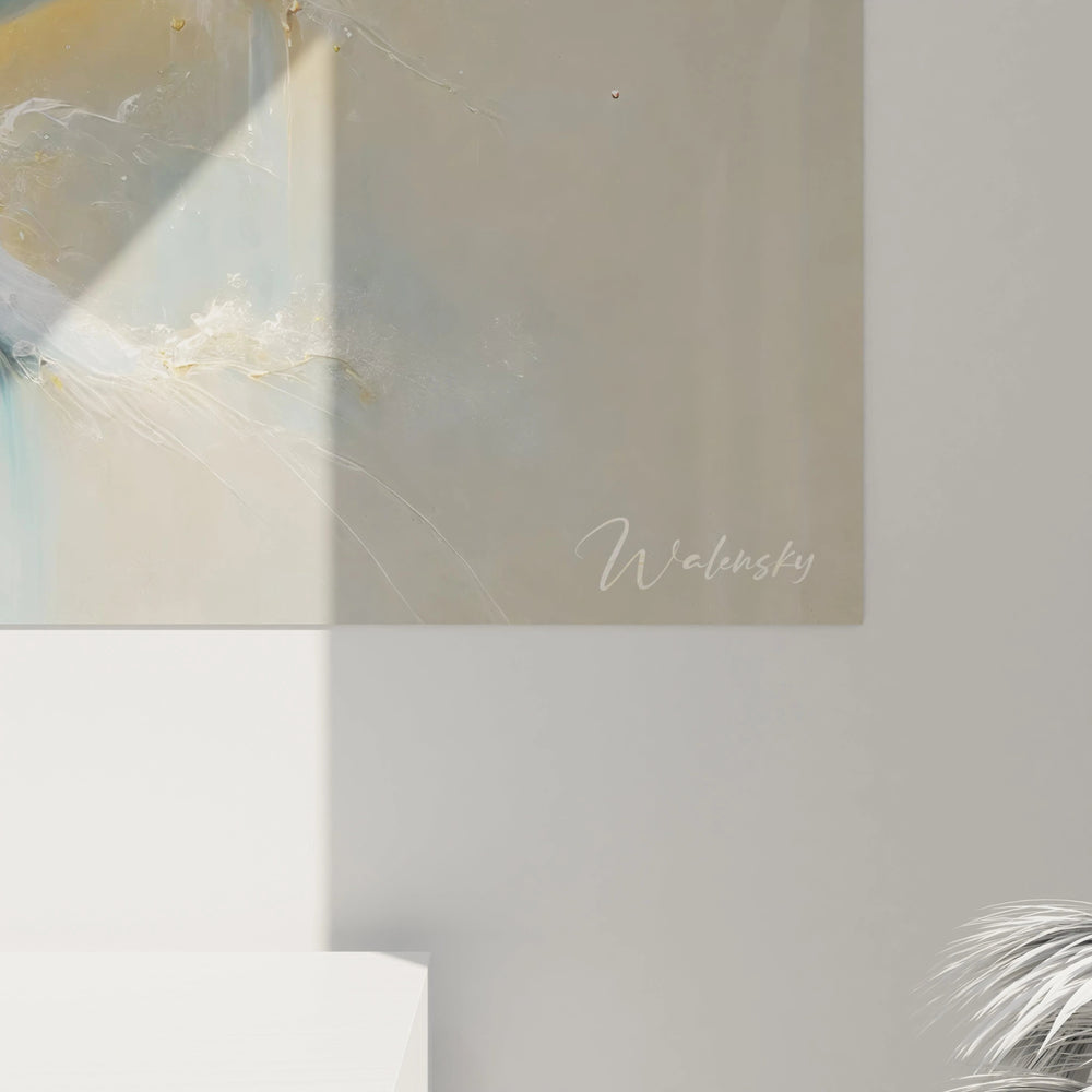 Le spectacle visuel que déploie ce tableau vous transporte immédiatement dans un univers de calme et de rêve. Les nuances délicates de bleu clair, caressées de reflets dorés, semblent onduler doucement sous vos yeux, comme une caresse lumineuse au cœur de l’océan. La texture fluide et presque éthérée, mêlée à un beige chaleureux, enveloppe la silhouette imposante du cachalot d’une aura sublime, exhalant une douceur rare.