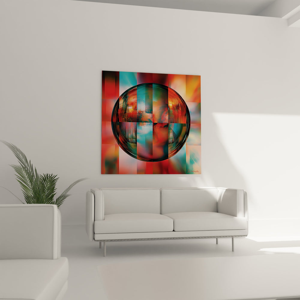La palette chromatique de ce tableau géométrique moderne oscille entre des tons chauds orangés, des rouges profonds et des bleus turquoise rafraîchissants. Cette œuvre d'art abstraite murale symbolise la convergence entre le monde digital et l'expression artistique traditionnelle. La sphère centrale représente l'œil de l'observateur, invitant à une introspection visuelle et à une réflexion sur la perception de la réalité à travers les filtres de l'art contemporain.