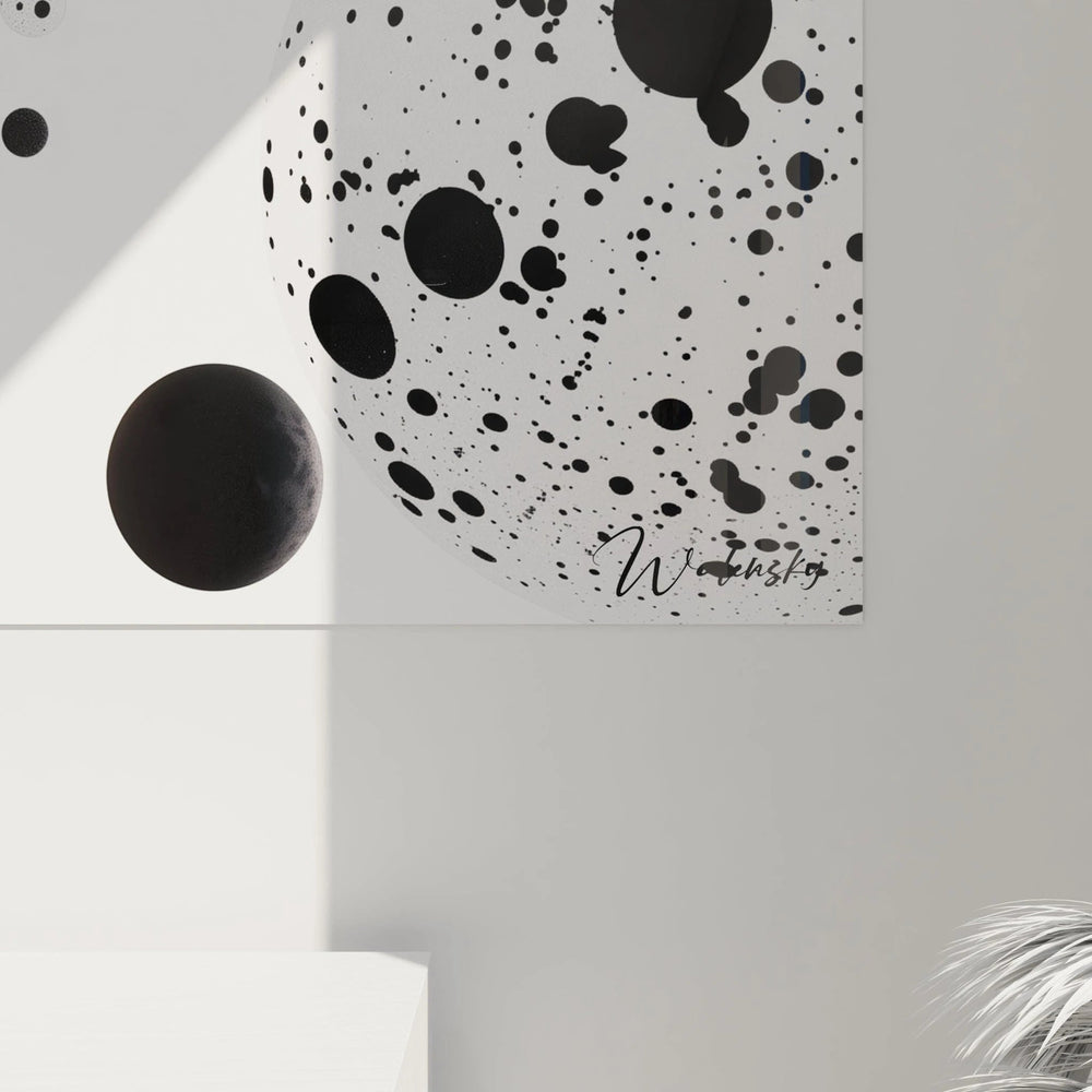 Ce tableau ne se contente pas d’habiller votre intérieur : il crée un dialogue subtil entre le minimalisme élégant et la complexité cosmique. Sa palette contrastée mêle un noir profond à un blanc éclatant, agrémenté de touches tachetées qui insufflent vie et rythme. L’effet visuel rappelle la danse silencieuse des corps célestes, offrant une invitation à la rêverie et à la méditation personnelle.