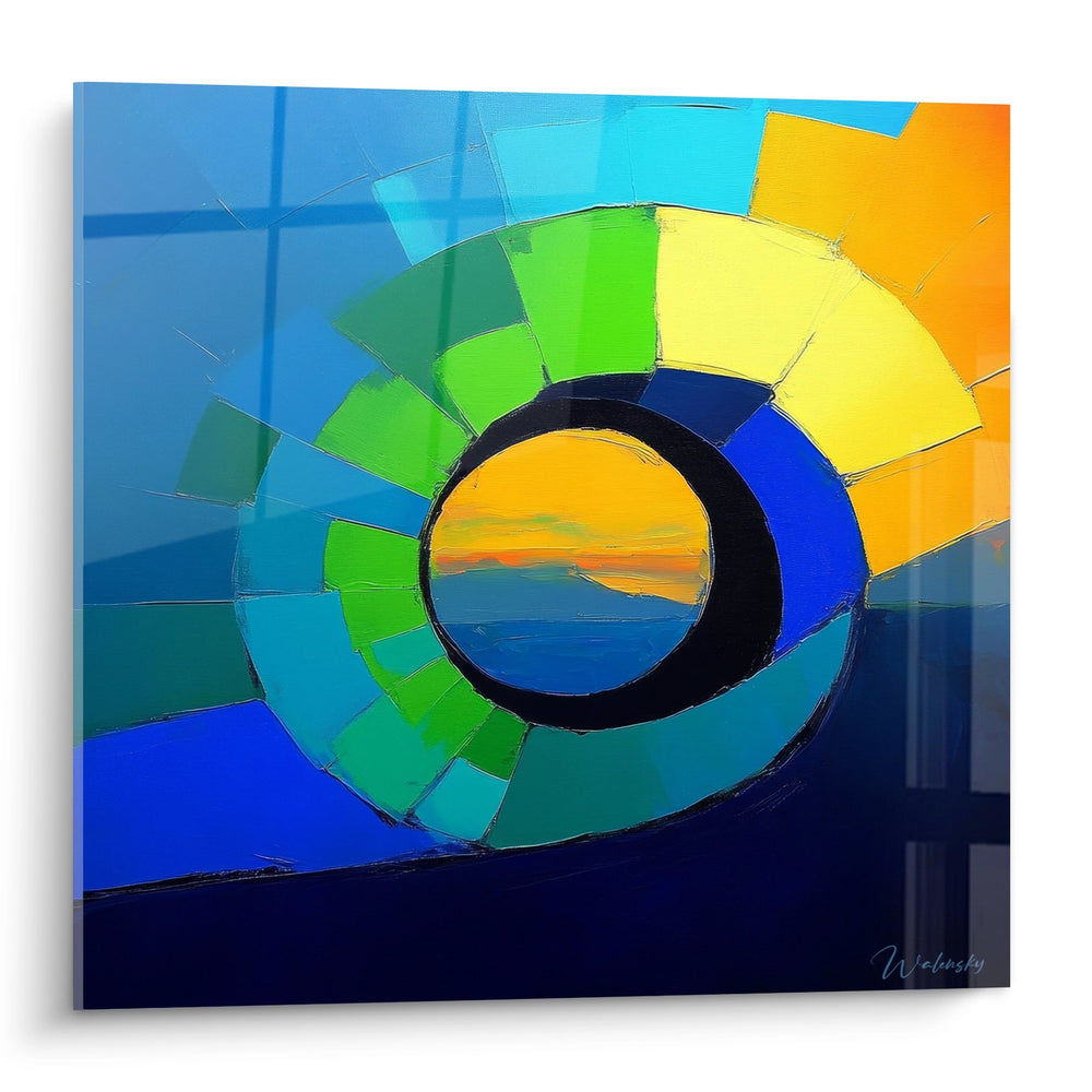 Ce tableau mural spirale abstrait présente une composition fascinante où les couleurs s'organisent en une spirale colorée hypnotique. La structure circulaire déploie un arc-en-ciel géométrique allant du bleu profond aux oranges éclatants, en passant par des verts lumineux et des jaunes solaires. Au centre de cette œuvre d'art abstraite, un cercle noir délimite une fenêtre vers un paysage marin aux tons dorés, créant un contraste saisissant avec la géométrie environnante. Les segments colorés rayonnent depuis ce point central, formant une spirale décorative moderne qui évoque le mouvement perpétuel et l'harmonie cosmique. Cette peinture abstraite géométrique transforme l'espace par sa dynamique visuelle, où chaque couleur trouve sa place dans un équilibre parfait. Le tableau décoratif contemporain joue avec la perception, invitant le regard à suivre la courbe infinie de la spirale. Les nuances se fondent et se distinguent tour à tour, créant une œuvre murale design qui capte la lumière et anime l'environnement. La technique picturale révèle des empâtements subtils qui donnent du relief à chaque segment coloré, renforçant l'effet tridimensionnel de cette décoration murale artistique exceptionnelle.