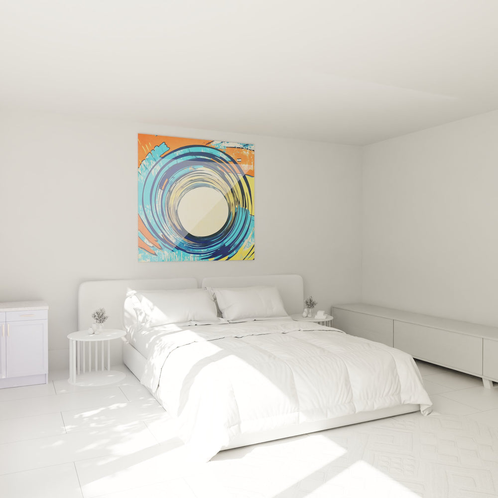 La palette chromatique de ce tableau spirale abstrait joue sur des contrastes saisissants entre les oranges énergiques, les bleus profonds et les jaunes lumineux. Ces couleurs symbolisent respectivement la créativité, la sérénité et l'optimisme, créant un équilibre émotionnel parfait. Le centre crème apporte une zone de repos visuel qui amplifie l'effet de mouvement des couleurs vives abstraites environnantes.