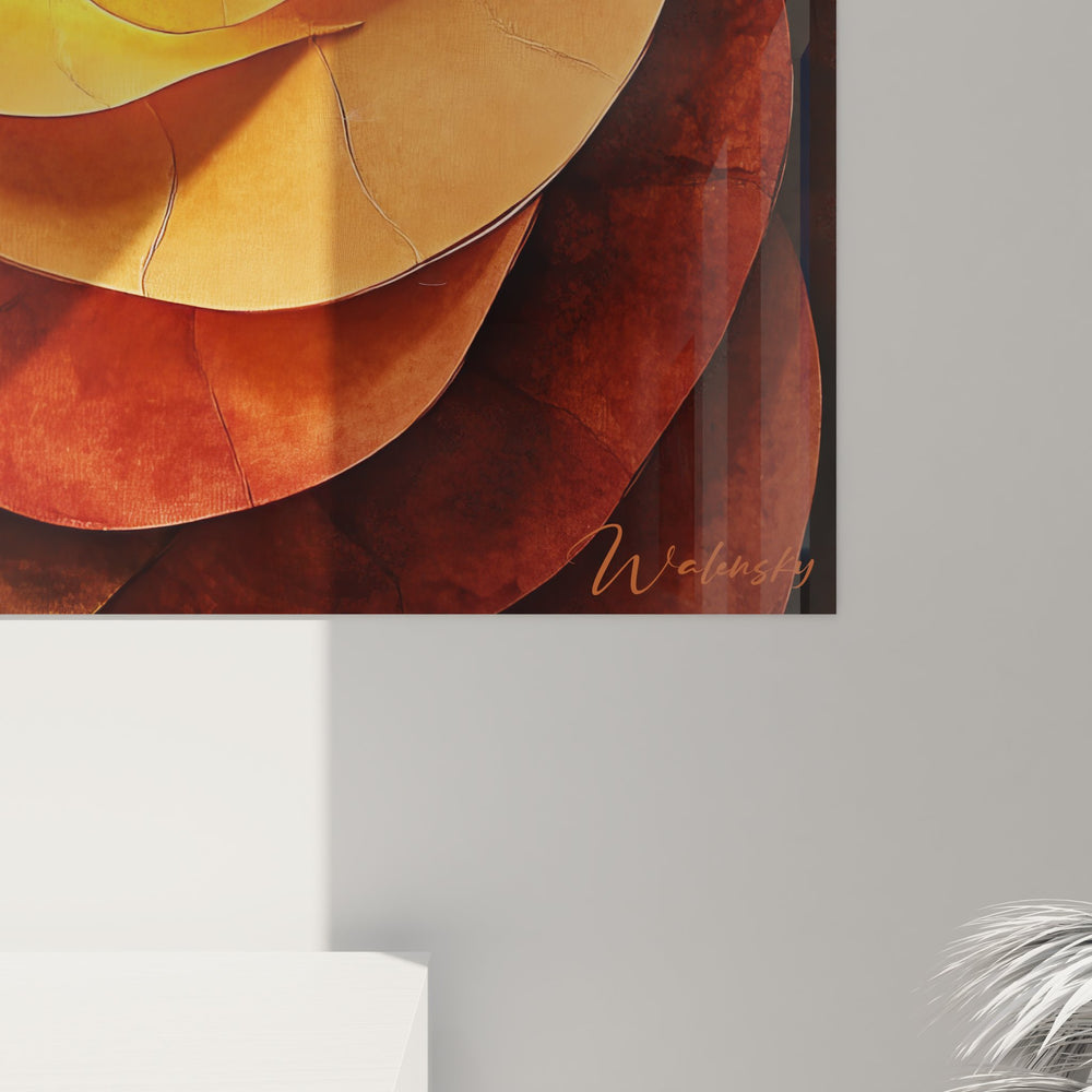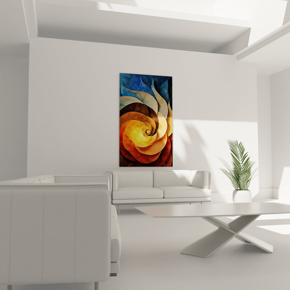 Ce tableau spirale abstrait présente une composition hypnotique où les formes tourbillonnaires s'entremêlent dans une danse chromatique saisissante. La spirale colorée centrale déploie ses volutes dans un mouvement perpétuel, évoquant les flammes d'un brasier cosmique. Les tons chauds dominent la partie inférieure avec des nuances dorées et orangées qui s'intensifient vers le cœur de la spirale, créant un effet de profondeur remarquable. Cette œuvre d'art mural moderne capture l'essence du mouvement à travers ses courbes fluides et ses transitions chromatiques subtiles. Les flammes abstraites semblent jaillir du centre pour se transformer progressivement en volutes bleues et grises dans la partie supérieure, créant un contraste saisissant entre chaleur et fraîcheur. Ce tableau mural spirale exploite magistralement la technique de dégradé pour guider le regard dans un voyage visuel captivant. L'artiste a su maîtriser l'équilibre entre dynamisme et harmonie, offrant une décoration murale artistique qui transforme instantanément l'atmosphère d'un espace. Les lignes courbes s'entrelacent avec une précision géométrique tout en conservant une fluidité organique, caractéristique de l'art contemporain abstrait.