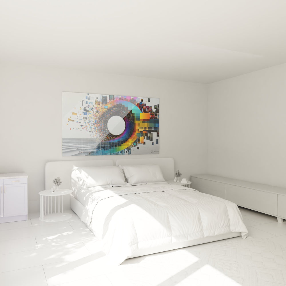 Ce tableau mural spirale colorée présente une composition fascinante où l'art digital rencontre l'abstraction géométrique. Au centre de l'œuvre, un cercle blanc immaculé agit comme point focal, entouré d'une spirale dynamique composée de milliers de pixels colorés. La spirale abstrait moderne se déploie dans un mouvement tourbillonnaire hypnotique, créant un effet de profondeur saisissant. Les éléments pixelisés s'organisent en formations architecturales évoquant des gratte-ciels urbains et des structures digitales. Cette œuvre d'art contemporain mélange habilement les tons chauds et froids, créant des zones de haute intensité chromatique qui contrastent avec des espaces plus neutres. La décoration murale moderne révèle une explosion de fragments colorés qui semblent s'échapper de la spirale centrale, suggérant un univers digital en perpétuelle expansion. Les pixels multicolores forment des motifs complexes rappelant les algorithmes informatiques et les visualisations de données. Cette spirale géométrique abstraite transforme l'espace de vie en galerie contemporaine, offrant une expérience visuelle immersive qui évolue selon l'angle d'observation.