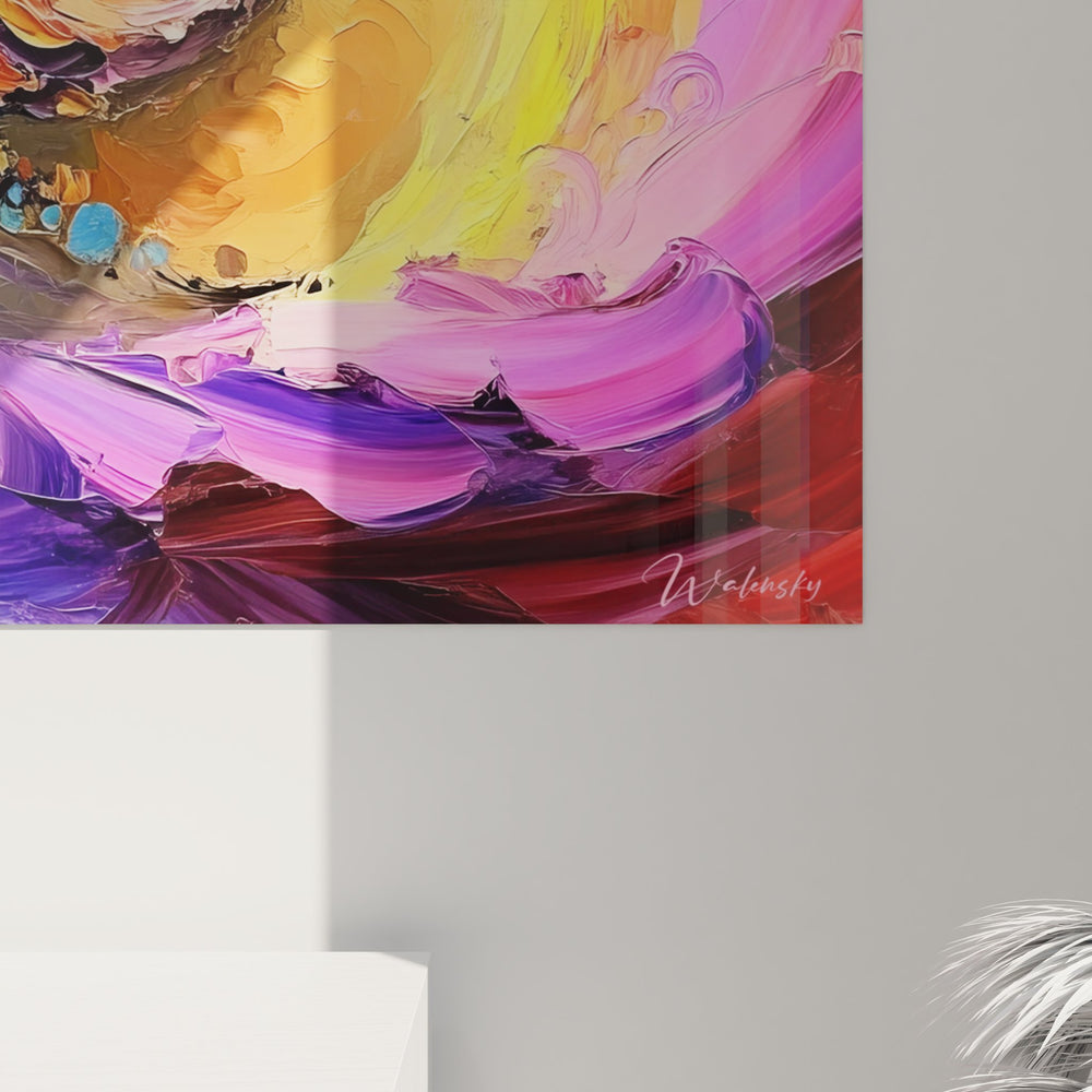 Ce tableau mural spirale cosmique présente une composition extraordinaire où les formes tourbillonnantes se mélangent dans un ballet de couleurs éclatantes. Au centre de cette œuvre d'art abstraite, une spirale dorée et orangée évoque un soleil naissant, tandis que des volutes violettes, roses et bleues s'entremêlent autour de cette source lumineuse centrale. Les couleurs vibrantes du tableau créent un effet de mouvement perpétuel, comme si l'observateur contemplait la naissance d'une galaxie ou l'éclosion d'une fleur cosmique géante. La technique de peinture épaisse révèle des textures riches qui donnent une dimension tactile à cette spirale abstrait colorée. Les nuances se fondent harmonieusement, passant des tons chauds dorés aux teintes froides bleutées, créant ainsi un équilibre parfait entre dynamisme et sérénité. Cette décoration murale moderne captive le regard par sa complexité visuelle et son énergie positive, transformant instantanément l'atmosphère de n'importe quel espace de vie.