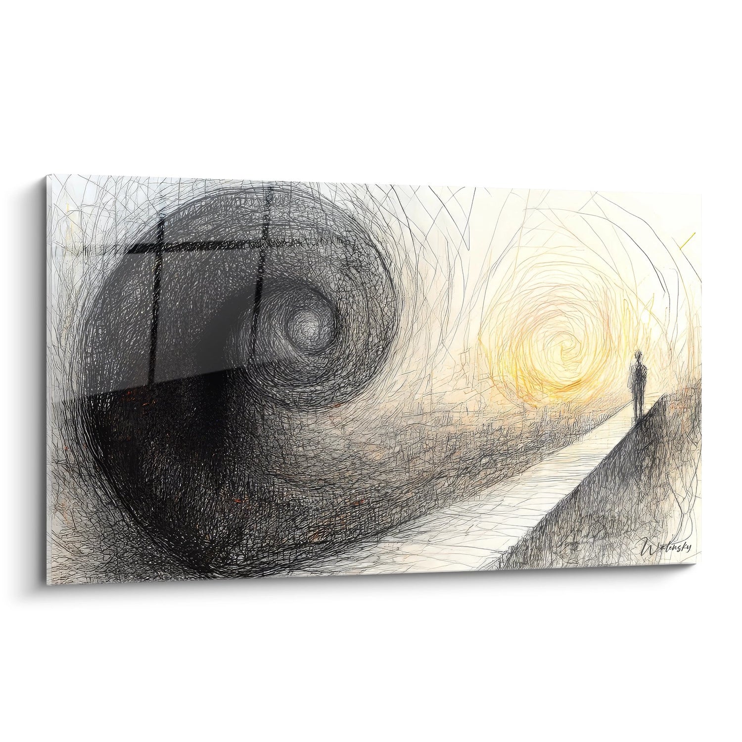 La symbolique des spirales dans cette œuvre évoque le cycle éternel de la vie, la croissance et l'évolution spirituelle. La dualité entre ombre et lumière représente les forces opposées qui régissent l'existence. La palette chromatique, dominée par les nuances de gris, noir et or, symbolise le passage des ténèbres vers l'illumination. Cette décoration murale philosophique invite à une réflexion profonde sur notre condition humaine face à l'immensité cosmique.