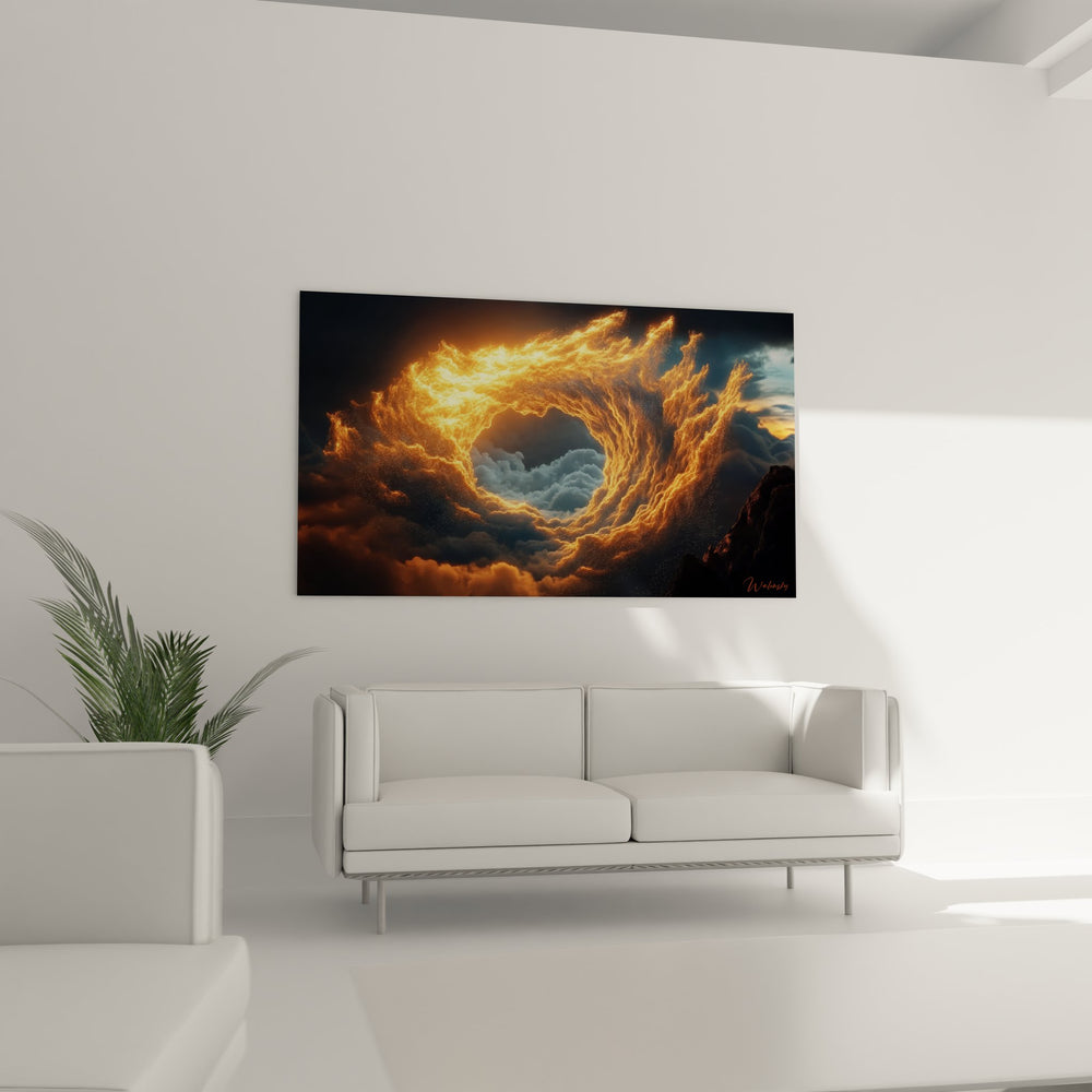 Cette œuvre d'art exceptionnelle présente une spirale de feu dorée majestueuse qui forme un portail mystique au cœur des nuages. Le tableau mural spirale enflammée capture un moment saisissant où les éléments naturels se transforment en une vision féerique. Les flammes dorées tourbillonnent avec une intensité hypnotique, créant un tunnel lumineux qui semble ouvrir une porte vers un autre monde. Cette décoration murale spirale dorée révèle des détails fascinants : chaque particule de feu danse avec grâce, les volutes s'entremêlent dans un ballet cosmique parfaitement orchestré. L'art mural spirale céleste transcende la simple représentation pour devenir une invitation au voyage intérieur. Les nuages environnants, teintés de bleu profond et d'orange cuivré, créent un contraste saisissant avec l'éclat doré de la spirale centrale. Cette peinture spirale feu mystique évoque la puissance créatrice de l'univers, où les forces élémentaires se conjuguent pour donner naissance à des phénomènes extraordinaires. Le tableau décoratif spirale enflammée transforme instantanément l'atmosphère d'un intérieur, apportant une dimension spirituelle et énergétique unique qui ne laisse personne indifférent.